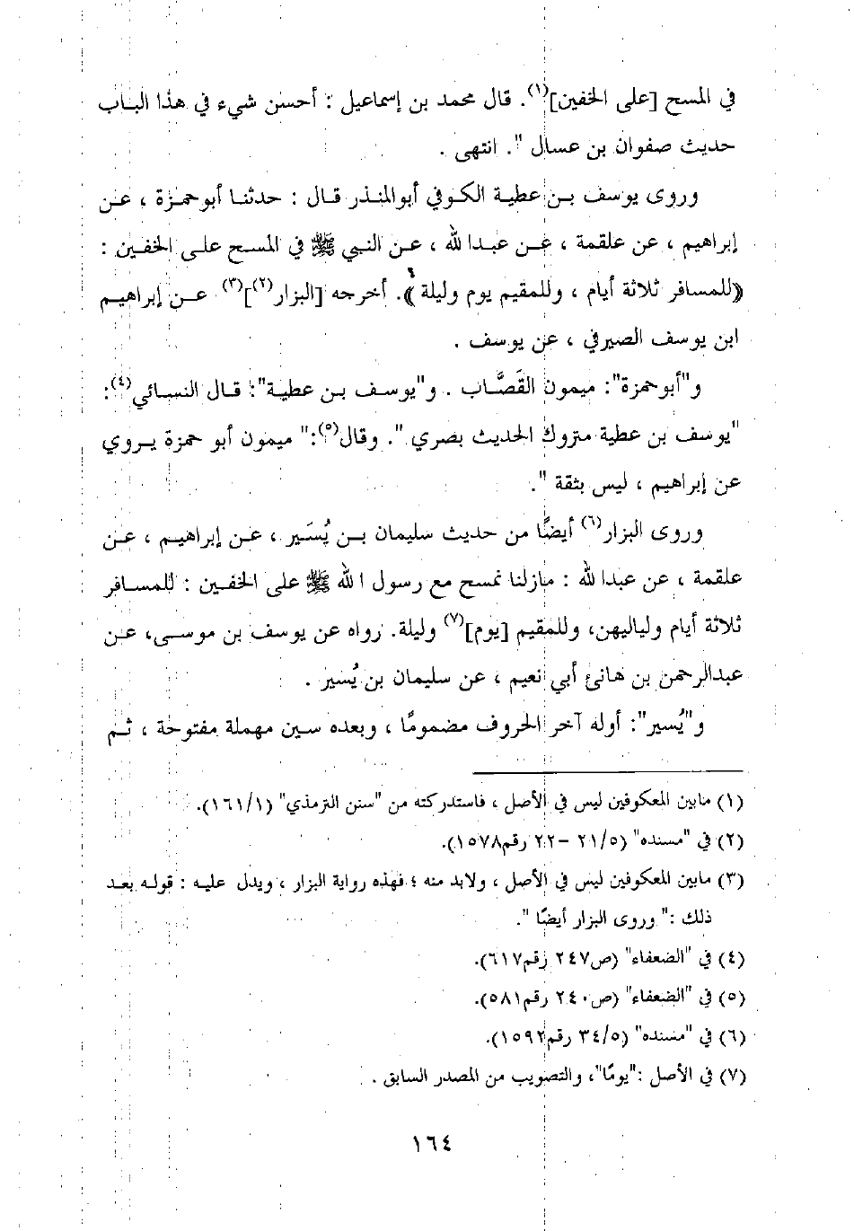 وروى البزار أيضا من حديث سليمان بن يسير، عن إبراهيم، عن علقمة، عن عبد الله: ما زلنا نمسح مع رسول الله صلى الله عليه وسلم على الخفين: للمسافر ثلاثة أيام ولياليهن، وللمقيم [يوم] وليلة. رواه عن يوسف بن موسى، عن عبد الرحمن بن هانئ أبي نعيم، عن سليمان بن يسير.