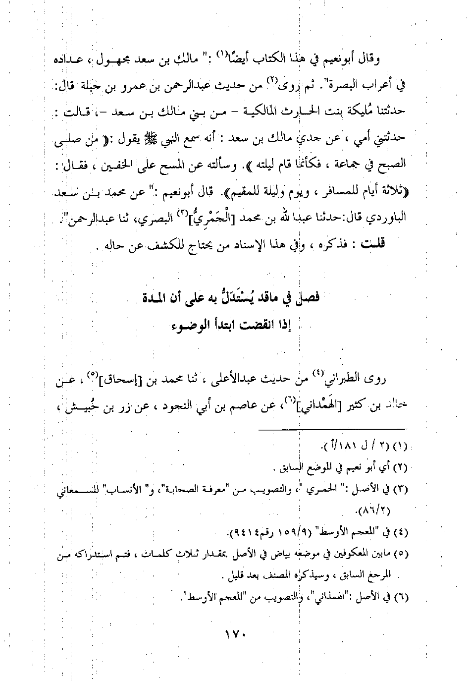 وقال أبو نعيم في هذا الكتاب أيضا: "مالك بن سعد مجهول، عداده في أعراب البصرة". ثم روى من حديث عبد الرحمن بن عمرو بن جبلة قال: حدثتنا مليكة بنت الحارث المالكية – من بني مالك بن سعد –، قالت: حدثتني أمي، عن جدي مالك بن سعد: أنه سمع النبي صلى الله عليه وسلم يقول: "من صلى الصبح في جماعة، فكأنما قام ليلته". وسألته عن المسح على الخفين، فقال: "ثلاثة أيام للمسافر، ويوم وليلة للمقيم". قال أبو نعيم: "عن محمد بن سعد البارودي قال: حدثنا عبد الله بن محمد [الجمري] البصري، ثنا عبد الرحمن".