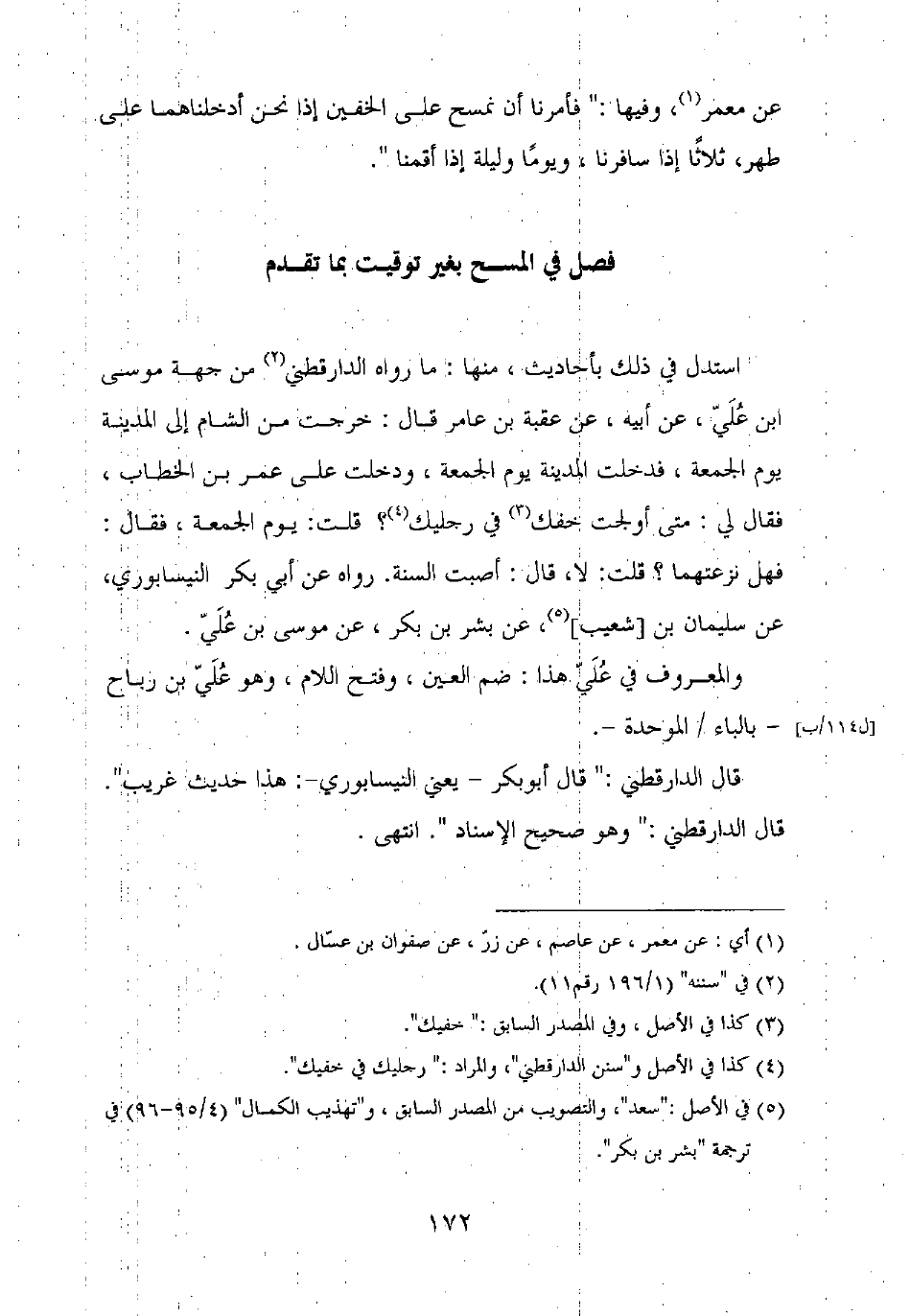 استدل في ذلك بأحاديث، منها: ما رواه الدارقطني من جهة موسى بن علي، عن أبيه، عن عقبة بن عامر قال: خرجت من الشام إلى المدينة يوم الجمعة، فدخلت المدينة يوم الجمعة، ودخلت على عمر بن الخطاب، فقال لي: متى أولجت خفك في رجليك؟ قلت: يوم الجمعة، فقال: فهل نزعتهما؟ قلت: لا، قال: أصبت السنة. رواه عن أبي بكر النيسابوري، عن سليمان بن [شعيب]، عن بشر بن بكر، عن موسى بن علي.