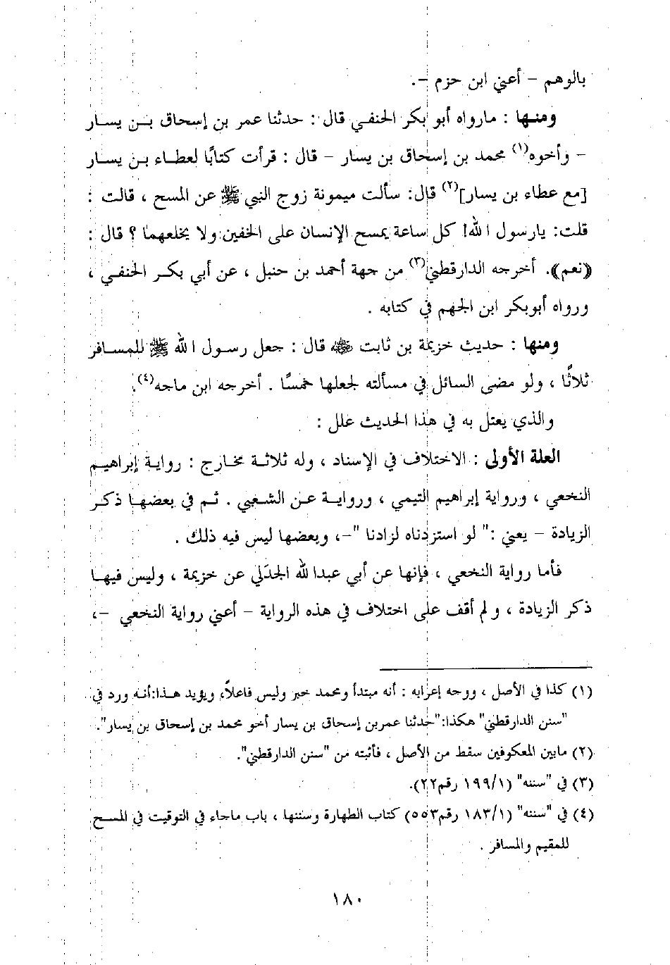 ومنها: ما رواه أبو بكر الحنفي قال: حدثنا عمر بن إسحاق بن يسار – وأخوه محمد بن إسحاق بن يسار – قال: قرأت كتابا لعطاء بن يسار [مع عطاء بن يسار] قال: سألت ميمونة زوج النبي صلى الله عليه وسلم عن المسح، قالت: قلت: يا رسول الله! كل ساعة يمسح الإنسان على الخفين ولا يخلعهما؟ قال: "نعم". أخرجه الدارقطني من جهة أحمد بن حنبل، عن أبي بكر الحنفي، ورواه أبو بكر ابن الجهم في كتابه.