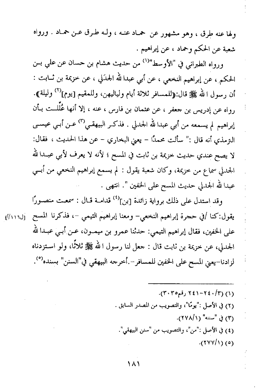 وروه الطبراني في "الأوسط" من حديث هشام بن حسان عن علي بن الحكم، عن إبراهيم النخعي، عن أبي عبد الله الجدلي، عن خزيمة بن ثابت: أن رسول الله صلى الله عليه وسلم قال: "للمسافر ثلاثة أيام ولياليهن، وللمقيم [يوم] وليلة".