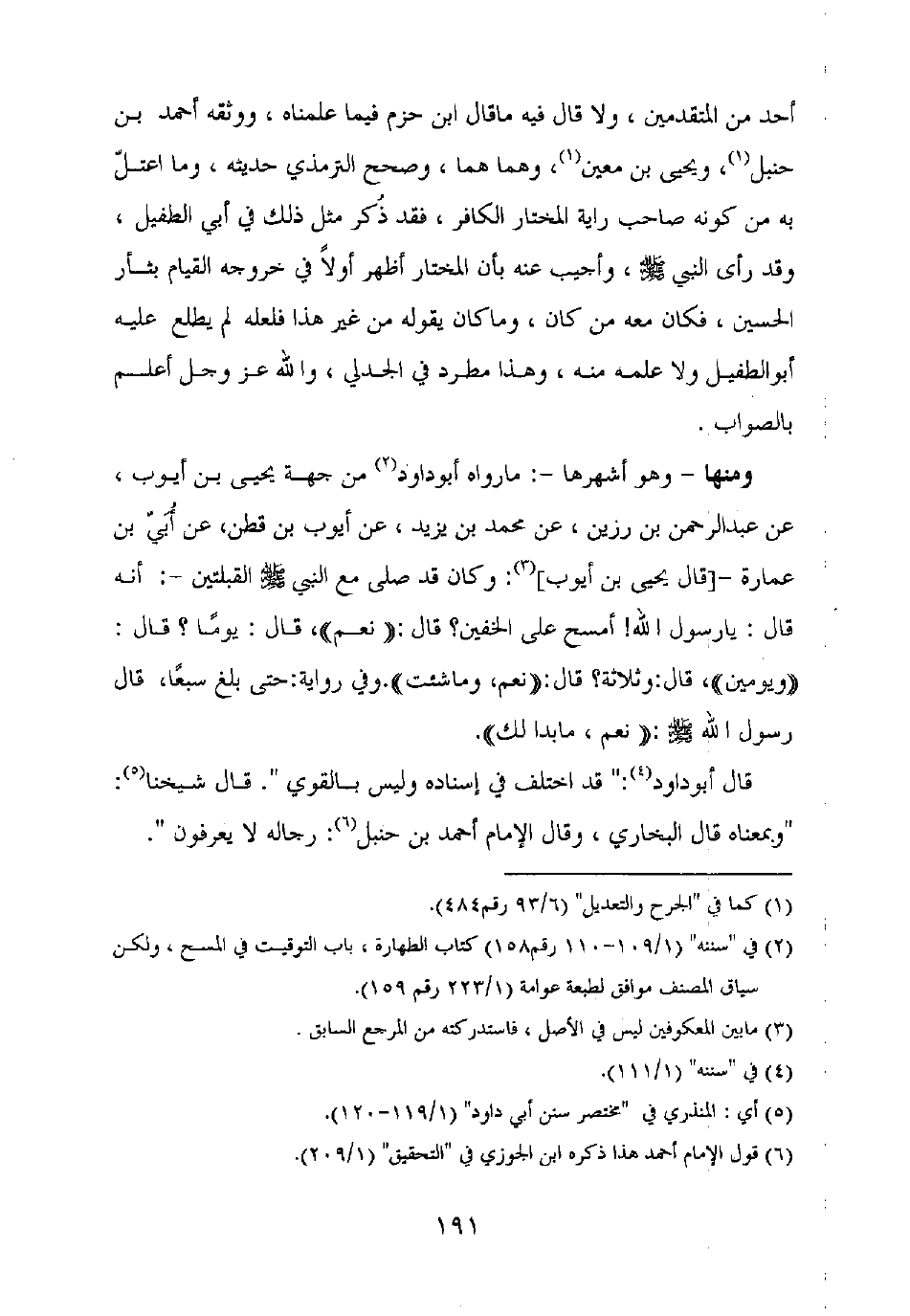 ومنها – وهو أشهرها –: ما رواه أبو داود من جهة يحيى بن أيوب، عن عبد الرحمن بن رزين، عن محمد بن يزيد، عن أيوب بن قطن، عن أبي بن عمارة -[قال يحيى بن أيوب]: وكان قد صلى مع النبي صلى الله عليه وسلم القبلتين –: أنه قال: يا رسول الله! أمسح على الخفين؟ قال: "نعم"، قال: يوما؟ قال: "ويومين"، قال: وثلاثة؟ قال: "نعم، وما شئت". وفي رواية: حتى بلغ سبعا، قال رسول الله صلى الله عليه وسلم: "نعم، ما بدا لك".