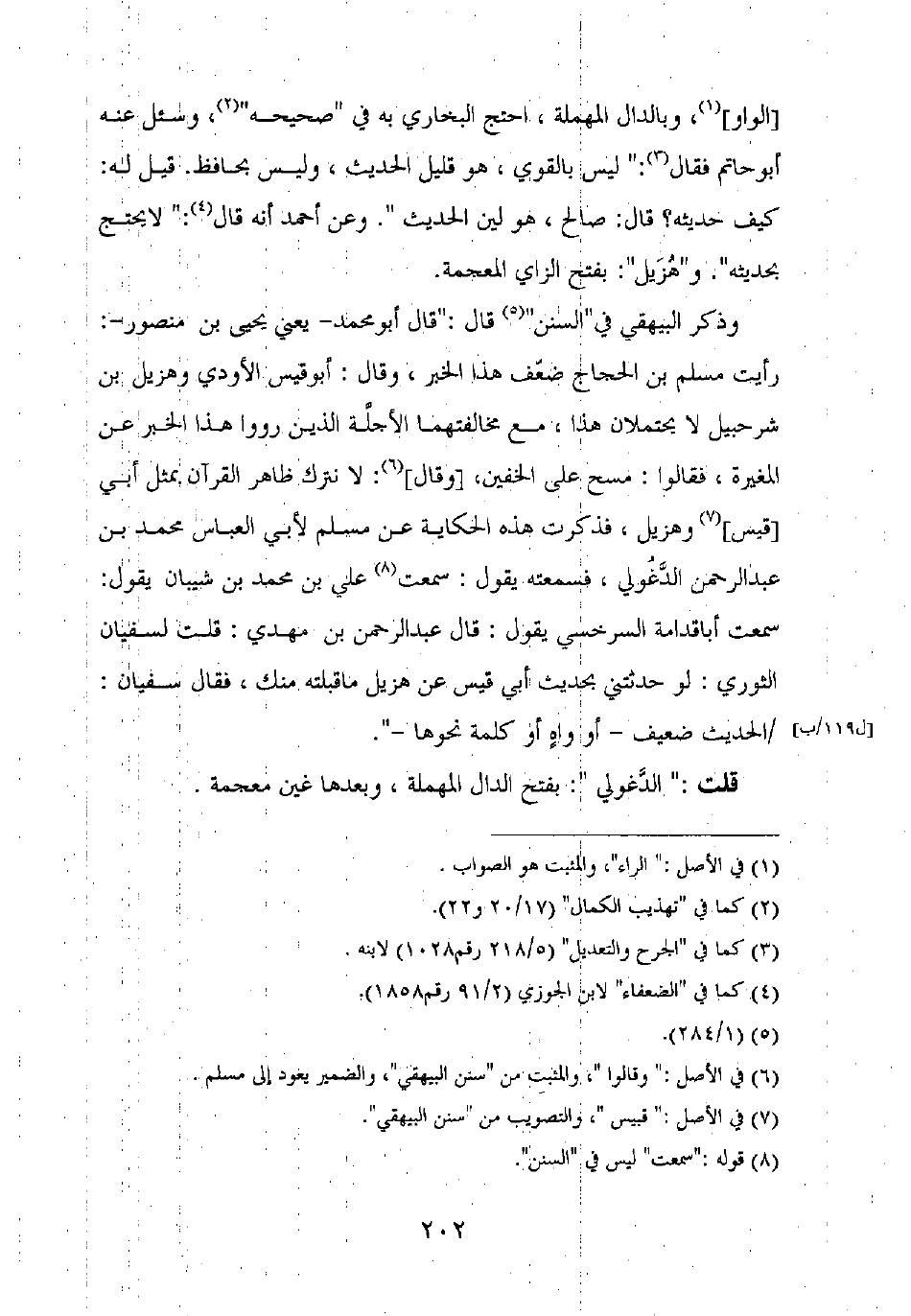 وذكر البيهقي في "السنن" قال: "قال أبو محمد – يعني يحيى بن منصور –: رأيت مسلم بن الحجاج ضعف هذا الخبر، وقال: أبو قيس الأودي وهزيل بن شرحبيل لا يحتملان هذا، مع مخالفتهما الأجلة الذين رووا هذا الخبر عن المغيرة، فقالوا: مسح على الخفين، [وقال]: لا نترك ظاهر القرآن بمثل أبي [قيس] وهزيل، فذكرت هذه الحكاية عن مسلم لأبي العباس محمد بن عبد الرحمن الدغولي، فسمعته يقول: سمعت علي بن محمد بن شيبان يقول: سمعت أبا قدامة السرخسي يقول: قال عبد الرحمن بن مهدي: قلت لسفيان الثوري: لو حدثتني بحديث أبي قيس عن هزيل ما قبلته منك، فقال سفيان: الحديث ضعيف – أو واه أو كلمة نحوها –. ".
