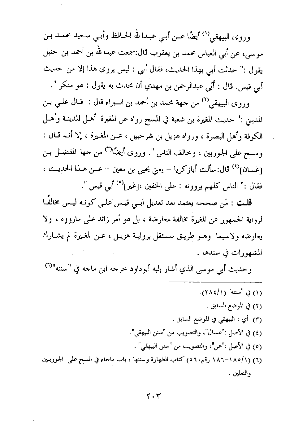 وروى البيهقي من جهة محمد بن أحمد بن البراء قال: قال علي بن المديني: "حديث المغيرة بن شعبة في المسح رواه عن المغيرة أهل المدينة وأهل الكوفة وأهل البصرة، ورواه هزيل بن شرحبيل، عن المغيرة، إلا أنه قال: ومسح على الجوربين، وخالف الناس". وروى أيضا من جهة المفضل بن [غسان] قال: سألت أبا زكريا – يعني يحيى بن معين – عن هذا الحديث، فقال: "الناس كلهم يروونه: على الخفين، " [غير] أبي قيس".