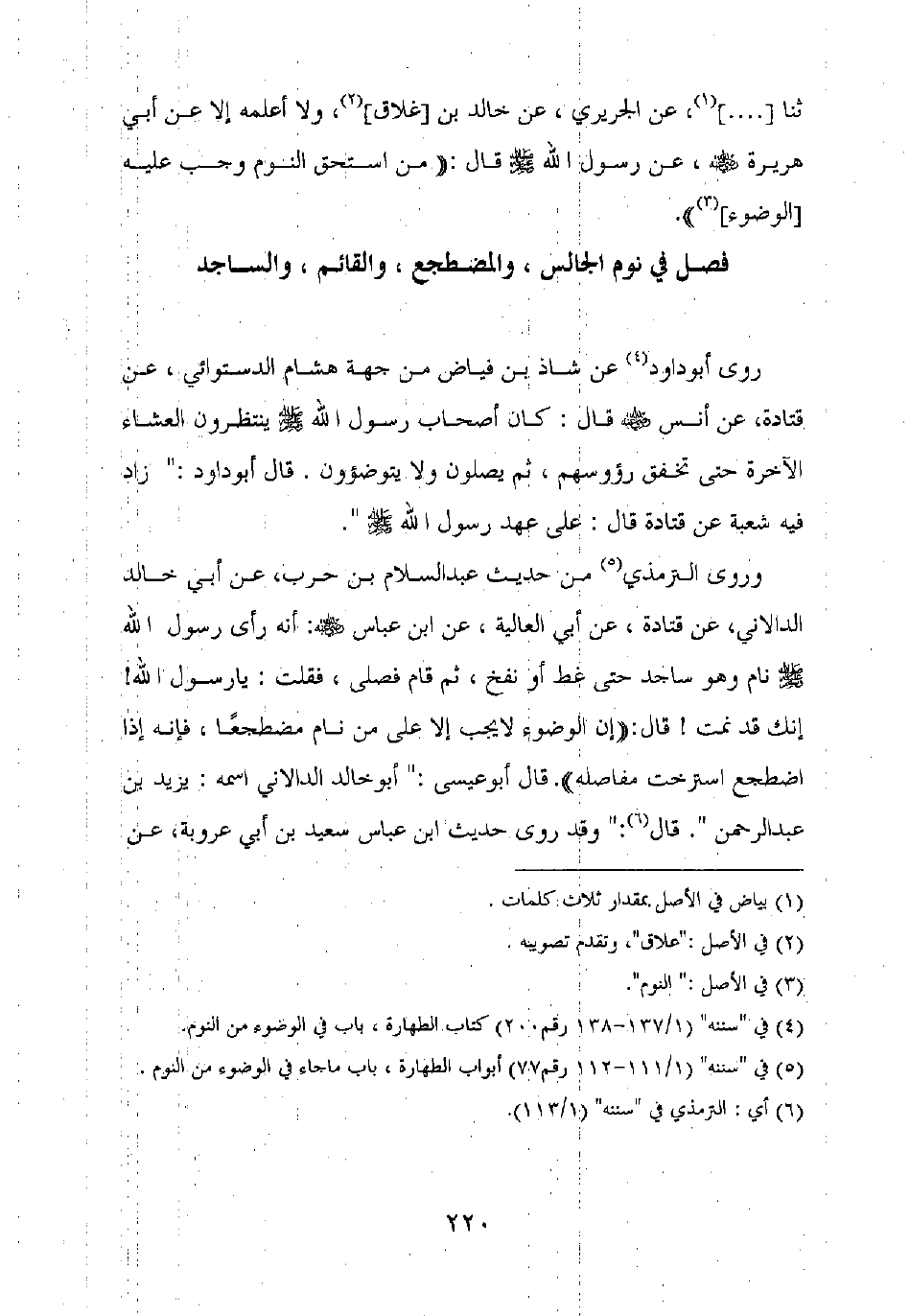 وروى الترمذي من حديث عبد السلام بن حرب، عن أبي خالد الدالاني، عن قتادة، عن أبي العالية، عن ابن عباس رضي الله عنه: أنه رأى رسول الله صلى الله عليه وسلم نام وهو ساجد حتى غط أو نفخ، ثم قام فصلى، فقلت: يا رسول الله! إنك قد نمت! قال: "إن الوضوء لا يجب إلا على من نام مضطجعا، فإنه إذا اضطجع استرخت مفاصله". قال أبو عيسى: "أبو خالد الدالاني اسمه: يزيد بن عبد الرحمن". قال: "وقد روى حديث ابن عباس سعيد بن أبي عروبة، عن