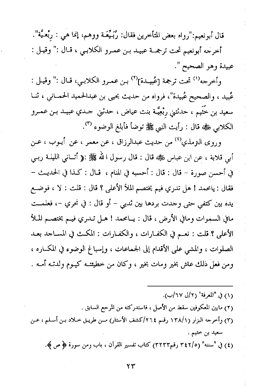 وروى الترمذي من حديث عبد الرزاق، عن معمر، عن أيوب، عن أبي قلابة، عن ابن عباس رضي الله عنه قال: قال رسول الله صلى الله عليه وسلم: "أتاني الليلة ربي في أحسن صورة – قال: قال: أحسبه في المنام، قال: كذا في الحديث – فقال: يا محمد! هل تدري فيم يختصم الملأ الأعلى؟ قال: قلت: لا، فوضع يده بين كتفي حتى وجدت بردها بين ثديي – او قال: في نحري –، فعلمت ما في السموات وما في الأرض، قال: يا محمد! هل تدري فيم يختصم الملأ الأعلى؟ قلت: نعم في الكفارات، والكفارات: المكث في المساجد بعد الصلوات، والمشي على الأقدام إلى الجماعات، وإسباغ الوضوء في المكاره، ومن فعل ذلك عاش بخير ومات بخير، وكان من خطيئته كيوم ولدته أمه.
