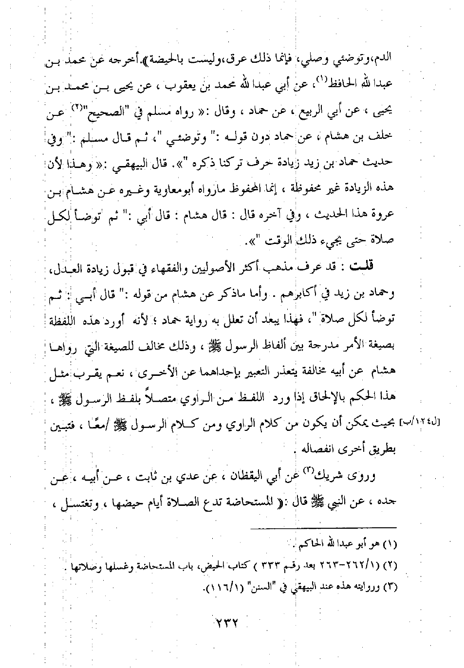 قلت: قد عرف مذهب أكثر الأصولين والفقهاء في قبول زيادة العدل، وحماد بن زيد في أكابرهم. وأما ما ذكر عن هشام من قوله: "قال أبي: ثم توضأ لكل صلاة"، فهذا يبعد أن تعلل به رواية حماد، لأنه أورد هذه اللفظه بصيغة الأمر مدرجة بين ألفاظ الرسول صلى الله عليه وسلم، وذلك مخالف للصيغة التي رواها هشام عن أبيه مخالفه يتعذر التعبير بإحداهما عن الأخرى، نعم يقرب مثل هذا الحكم بالإلحاق إذا ورد اللفظ من الراوي متصلا بلفظ الرسول صلى الله عليه وسلم، بحيث يمكن أن يكون من كلام الرواي ومن كلام الرسول صلى الله عليه وسلم معا، فتبين بطريق أخرى انفصاله.