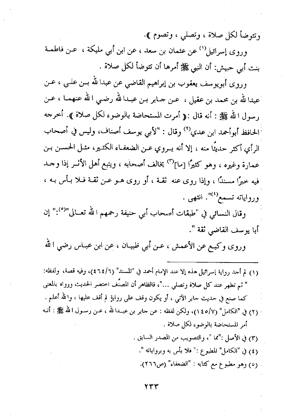 وروى أبو يوسف يعقوب بن إبراهيم القاضي عن عبد الله بن علي، عن عبد الله بن محمد بن عقيل، عن جابر بن عبد الله رضي الله عنهما، عن رسول الله صلى الله عليه وسلم: أنه قال: "أمرت المستحاضة بالوضوء لكل صلاة". أخرجه الحافظ أبو أحمد ابن عدي وقال: "لأبي يوسف أصناف، وليس في أصحاب الرأي أكثر حديثا منه، إلا أنه يروي عن الضعفاء الكثير، مثل الحسن بن عمارة وغيره، وهو كثيرا [ما] يخالف أصحابه، ويتبع أهل الأثر إذا وجد فيه خبرا مسندا، وإذا روى عنه ثقة، أو روى هو عن ثقة فلا بأس به، ورواياته تسمع". انتهى.