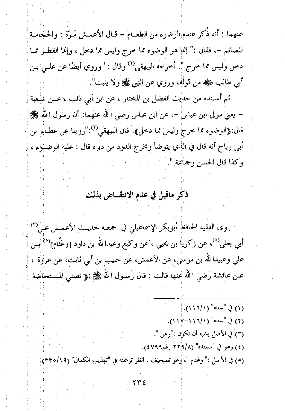 روى الفقيه الحافظ أبو بكر الإسماعيلي في جمعه لحديث الأعمش عن أبي يعلى، عن زكريا بن يحيى، عن وكيع وعبد الله بن داود [وعثام] بن علي وعبيد الله بن موسى، عن الأعمش، عن حبيب بن أبي ثابت، عن عروة، عن عائشة رضي الله عنها قالت: قال رسول الله صلى الله عليه وسلم: "تصلي المستحاضة