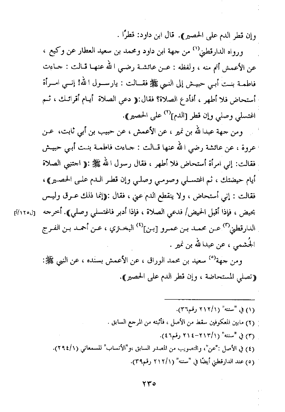 ومن جهة عبد الله بن نمير، عن الأعمش، عن حبيب بن أبي ثابت، عن عروة، عن عائشة رضي الله عنها قالت: جاءت فاطمة بنت أبي حبيش فقالت: إني امرأة أستحاض فلا أطهر، فقال رسول الله صلى الله عليه وسلم: "اجتنبي الصلاة أيام حيضتك، ثم اغتسلي وصومي وصلي وإن قطر الدم على الحصير"، فقالت: إني أستحاض، ولا ينقطع الدم عني، فقال: "إنما ذلك عرق وليس بحيض، فإذا أقبل الحيض فدعي الصلاة، فإذا أدبر فاغتسلي وصلي". أخرجه الدارقطني عن محمد بن عمرو [بن] البختري، عن أحمد بن الفرج الجشمي، عن عبد الله بن نمير.