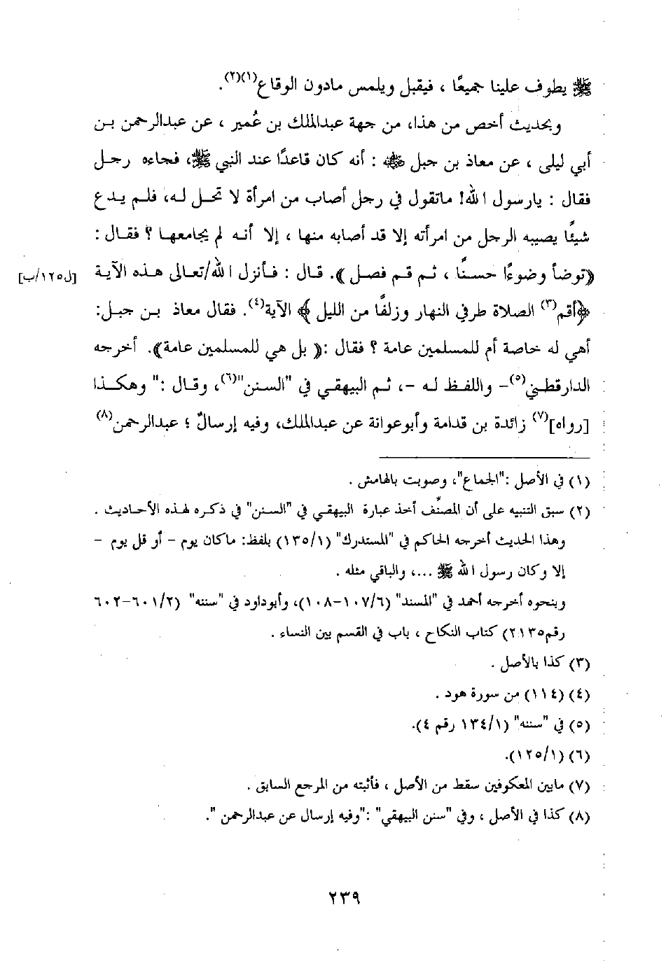 وبحديث أخص من هذا، من جهة عبد الملك بن عمير، عن عبد الرحمن بن أبي ليلى، عن معاذ بن جبل رضي الله عنه: أنه كان قاعدا عند النبي صلى الله عليه وسلم فجاءه رجل فقال: يا رسول الله! ما تقول في رجل أصاب من امرأة لا تحل له، فلم يدع شيئا يصيبه الرجل من امرأته إلا قد أصابه منها، إلا أنه لم يجامعها؟ فقال: "توضأ وضوءا حسنا، ثم قم فصل". قال: فأنزل الله تعالى هذه الأية {أقم الصلاة طرفي النهار وزلفا من الليل} الآية. فقال معاذ بن جبل: أهي له خاصة أم للمسلمين عامة؟ فقال: "بل هي للمسلمين عامة". أخرجه الدارقطني – واللفظ له –، ثم البيهقي في "السنن"، وقال: "وهكذا [رواه] زائدة بن قدامة وأبو عوانة عن عبد الملك، وفيه إرسال، عبد الرحمن