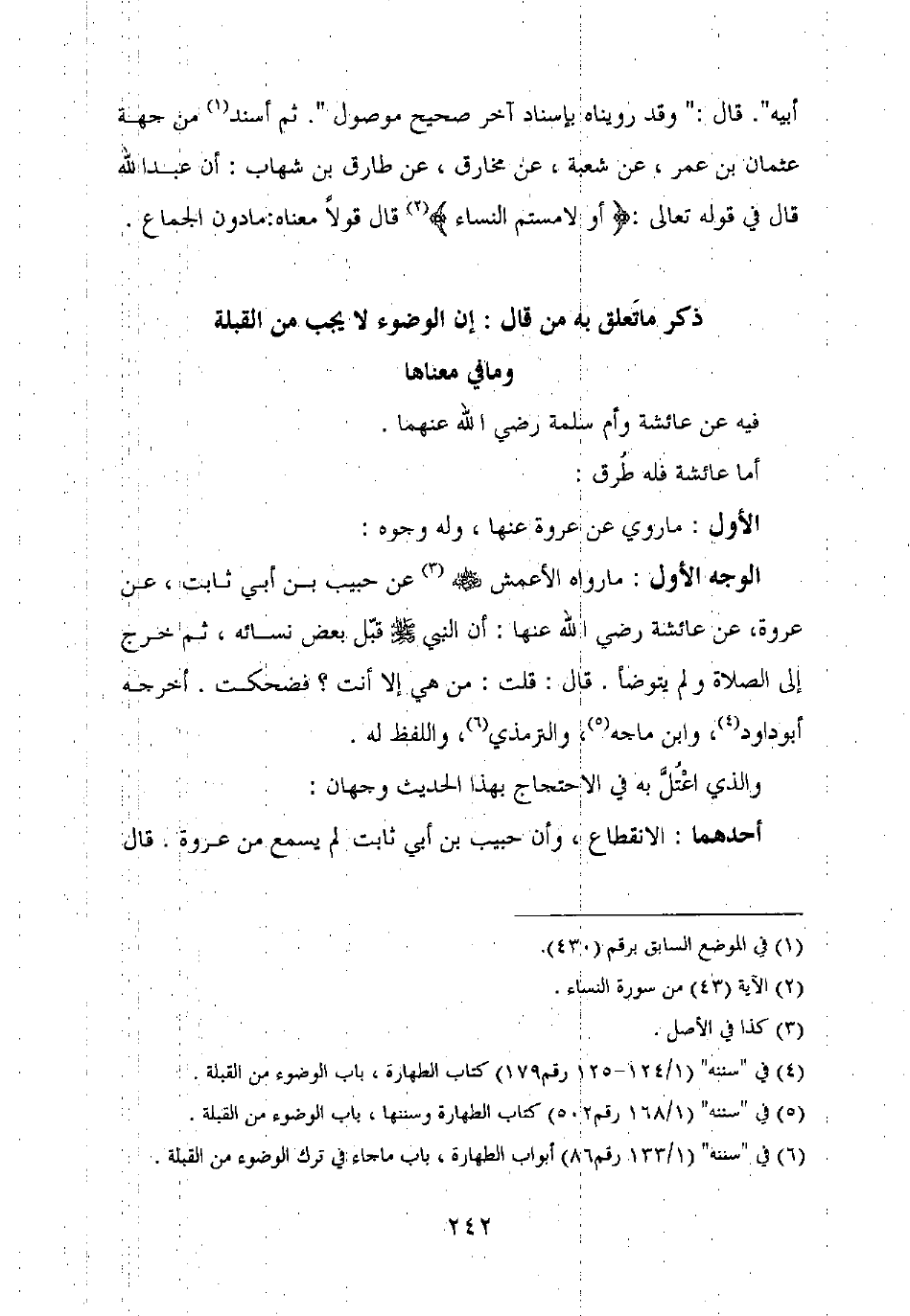 الوجه الأول: ما رواه الأعمش رضي الله عنه عن حبيب بن أبي ثابت، عن عروة، عن عائشة رضي الله عنها: أن النبي صلى الله عليه وسلم قبل بعض نسائه، ثم خرج إلى الصلاة ولم يتوضأ. قال: قلت: من هي إلا أنت؟ فضحكت. أخرجه أبو داود، وابن ماجة، والترمذي، واللفظ له.