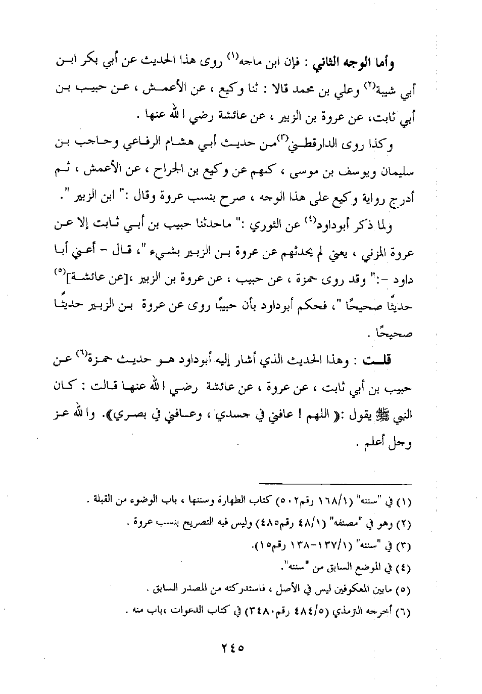 قلت: وهذا الحديث الذي أشار إليه أبو داود هو حديث حمزة عن حبيب بن أبي ثابت، عن عروة، عن عائشة رضي الله عنها قالت: كان النبي صلى الله عليه وسلم يقول: "اللهم! عافني في جسدي، وعافني في بصري". والله عز وجل أعلم.