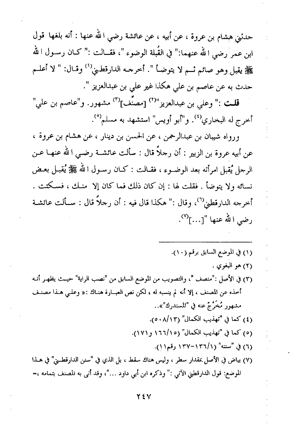 حدثني هشام بن عروة، عن أبيه، عن عائشة رضي الله عنها: أنه بلغها قول ابن عمر رضي الله عنهما: "في القبلة الوضوء"، فقالت: "كان رسول الله صلى الله عليه وسلم يقبل وهو صائم ثم لا يتوضأ". أخرجه الدارقطني وقال: "لا أعلم حدث به عن عاصم بن علي هكذا غير علي بن عبد العزيز".