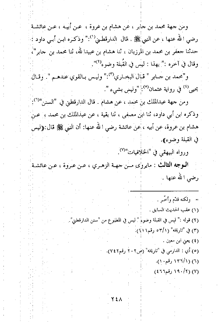 ومن جهة محمد بن جابر، عن هشام بن عروة، عن أبيه، عن عائشة رضي الله عنها، عن النبي صلى الله عليه وسلم. قال الدارقطني: "وذكر ابن أبي داود: حدثنا جعفر بن محمد بن المرزبان، ثنا هشام بن عبيد الله، ثنا محمد بن جابر"، وقال في آخره: "بهذا: ليس في القبلة وضوء".