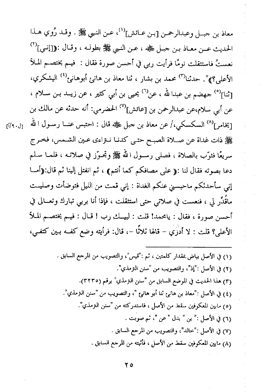 معاذ بن جبل وعبد الرحمن [بن عائش]، عن النبي صلى الله عليه وسلم. وقد روي هذا الحديث عن معاذ بن جبل رضي الله عنه، عن النبي صلى الله عليه وسلم بطوله، وقال: "إني نعست فاستثقلت نوما فرأيت ربي في أحسن صورة فقال: فيم يختصم الملأ الأعلى؟ ". حدثنا محمد بن بشار، ثنا معاذ بن هانئ أبو هانئ اليشكري، [ثنا] جهضم بن عبد الله، عن يحيى بن أبي كثير، عن زيد بن سلام، عن أبي سلام، عن عبد الرحمن بن [عائش] الحضرمي: أنه حدثه عن مالك بن [يخامر] السكسكي، عن معاذ بن جبل رضي الله عنه قال: احتبس عنا رسول الله صلى الله عليه وسلم ذات غداة عن صلاة الصبح حتى كدنا نتراءى عين الشمس، فخرج سريعا فثوب بالصلاة، فصلى رسول الله صلى الله عليه وسلم وتجوز في صلاته، فلما سلم دعا بصوته فقال لنا: "على مصافكم كما أنتم"، ثم انفتل إلينا ثم قال: "أما إني سأحدثكم ما حبسني عنكم الغداة: إني قمت من الليل فتوضأت وصليت ما قدر لي، فنعست في صلاتي حتى استثقلت، فإذا أنا بربي تبارك وتعالى في أحسن صورة، فقال: يا محمد! قلت: لبيك رب! قال: فيم يختصم الملأ الأعلى؟ قلت: لا أدري – قالها ثلاثا –، قال: فرأيته وضع كفه بين كتفي،