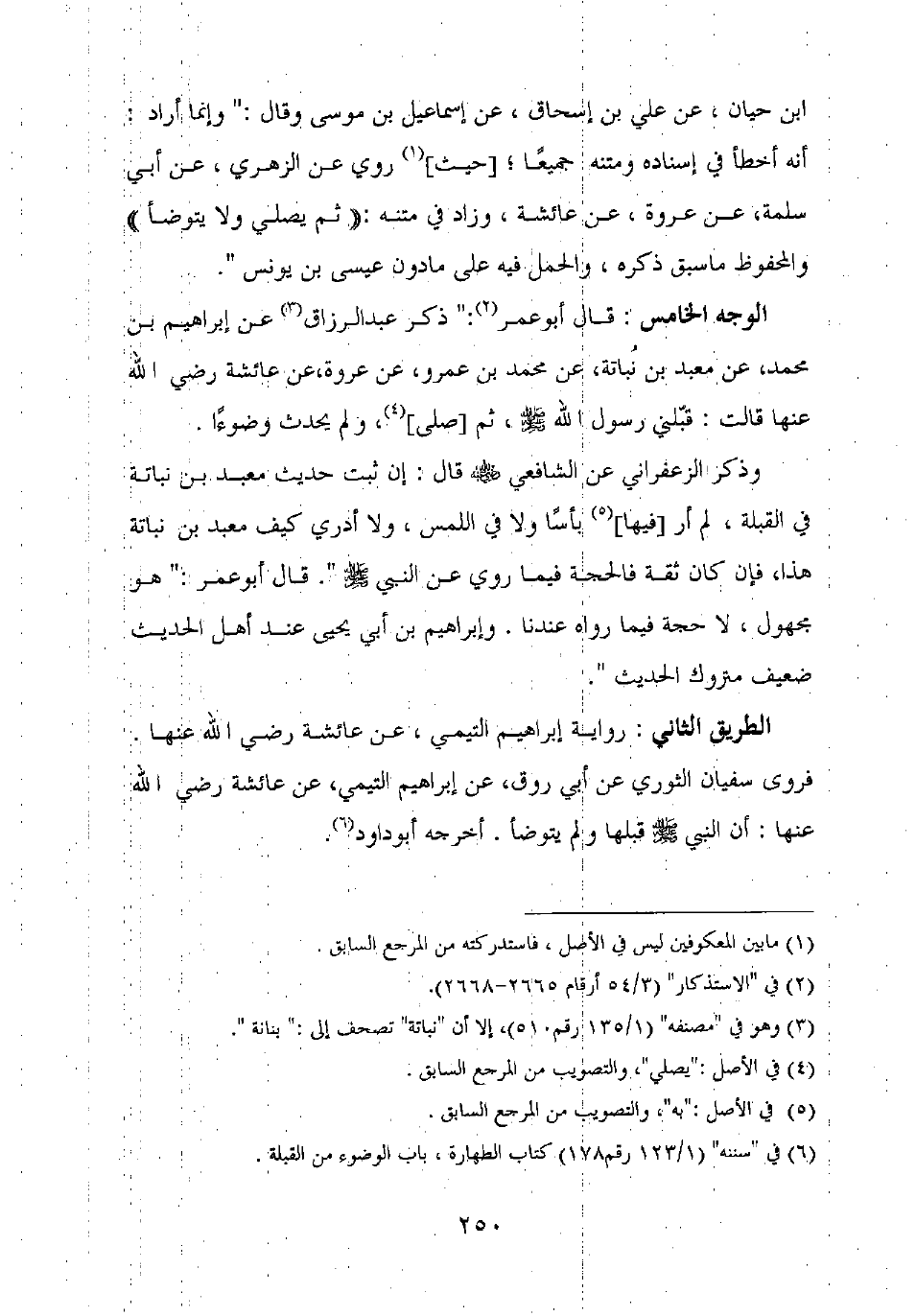 الوجه الخامس: قال أبو عمر: "ذكر عبد الرزاق عن إبراهيم بن محمد، عن معبد بن نباته، عن محمد بن عمرو، عن عروة، عن عائشة رضي الله عنها قالت: قبلني رسول الله صلى الله عليه وسلم، ثم [صلى]، ولم يحدث وضوءا".