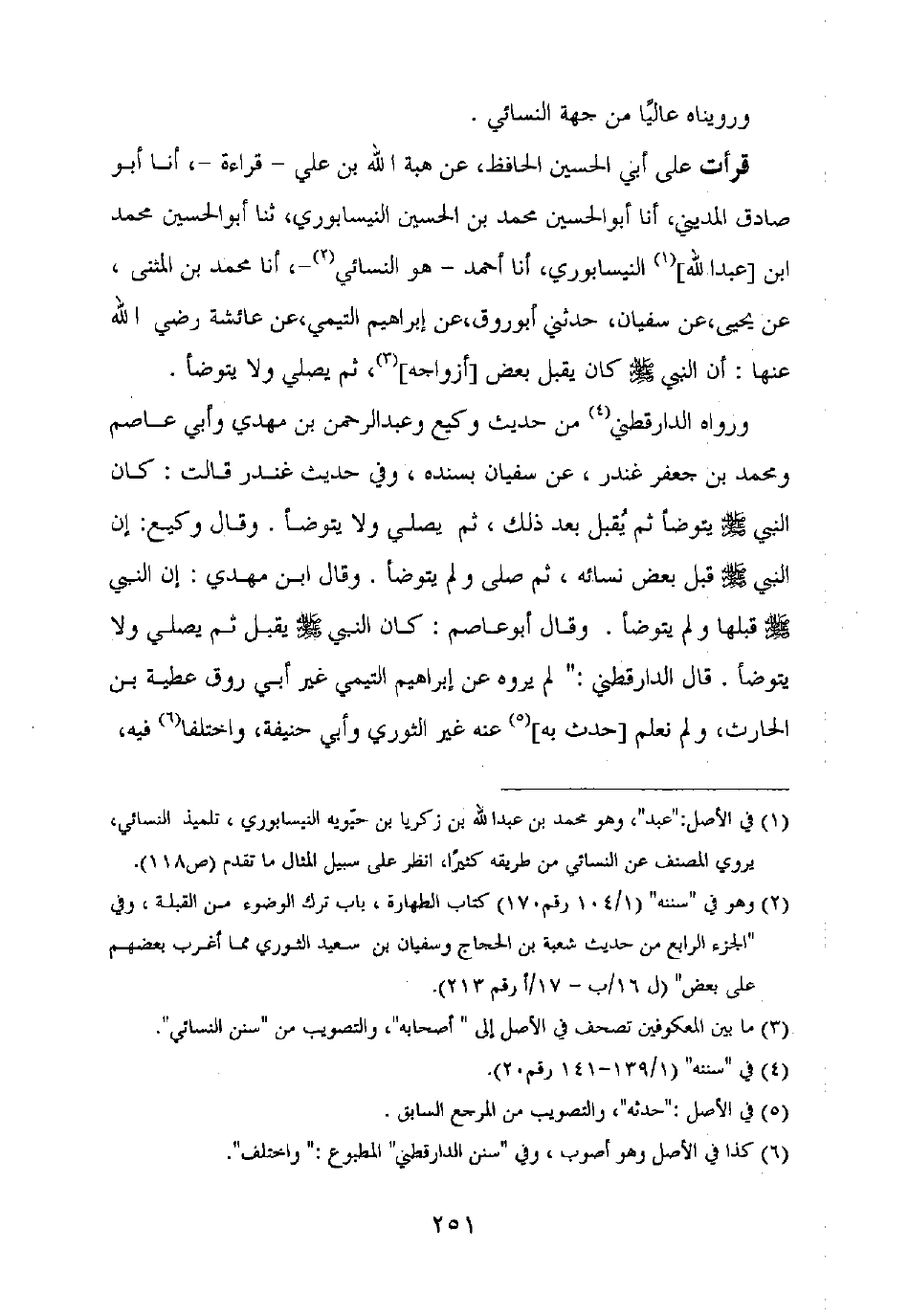 قرأت على أبي الحسين الحافظ، عن هبة الله بن علي – قراءة –، أنا أبو صادق المديني، أنا أبو الحسين محمد بن الحسين النيسابوري، ثنا أبو الحسين محمد بن [عبد الله] النيسابوري، أنا أحمد – هو النسائي –، أنا محمد بن المثنى، عن يحيى، عن سفيان، حدثني أبو روق، عن إبراهيم التيمي، عن عائشة رضي الله عنها: أن النبي صلى الله عليه وسلم كان يقبل بعض [أزواجه]، ثم يصلي ولا يتوضأ.