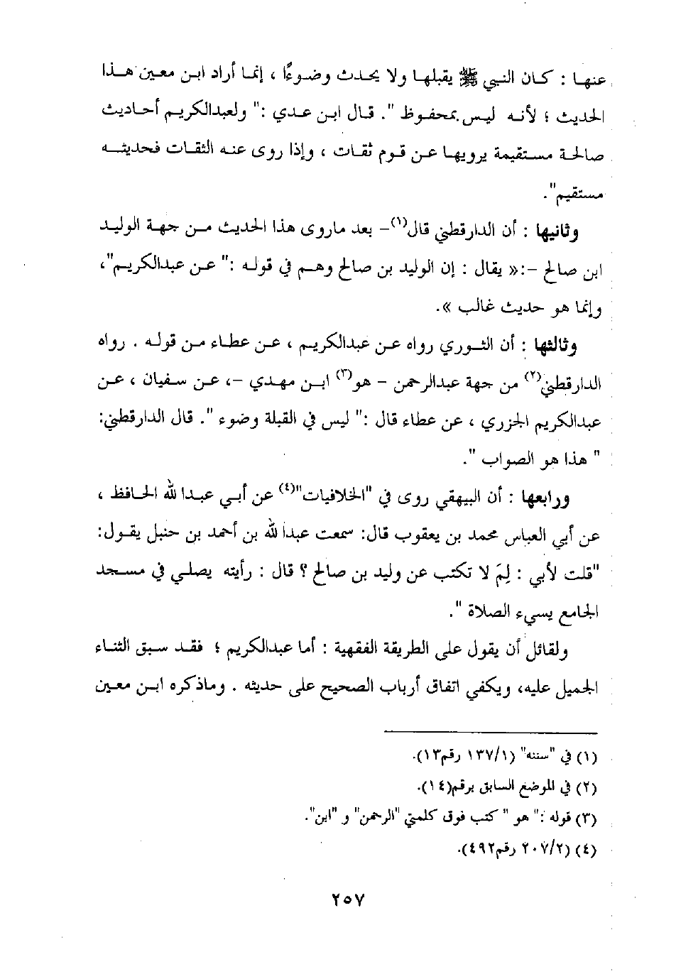 : كان النبي صلى الله عليه وسلم يقبلها ولا يحدث وضوءا، إنما أراد ابن معين هذا الحديث، لأنه ليس بمحفوظ". قال ابن عدي: "ولعبد الكريم أحاديث صالحة مستقيمة يوريها عن قوم ثقات، وإذا روى عنه الثقات فحديثه مستقيم".