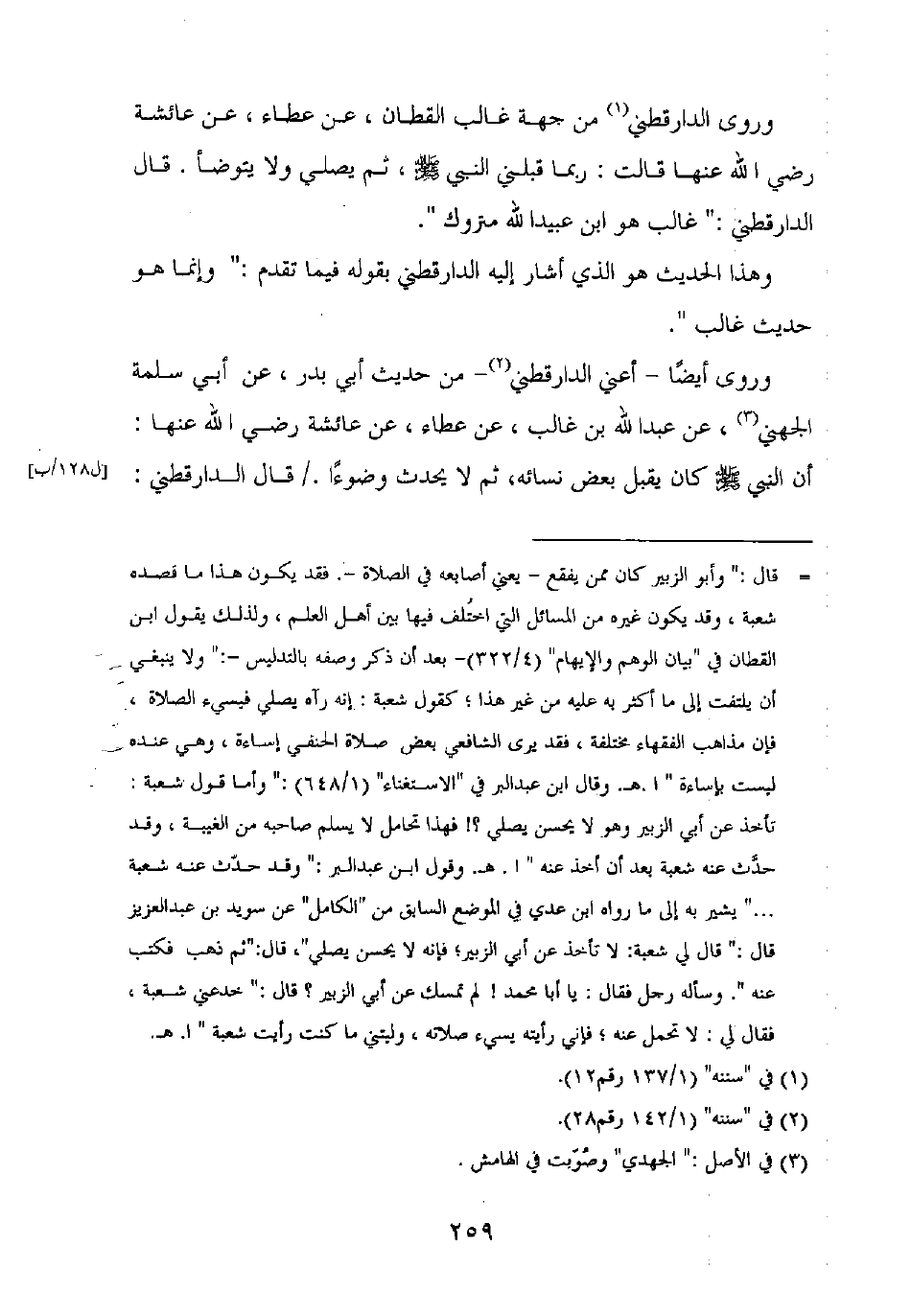 وروى أيضا – أعني الدارقطني – من حديث أبي بدر، عن أبي سلمة الجهني، عن عبد الله بن غالب، عن عطاء، عن عائشة رضي الله عنها: أن النبي صلى الله عليه وسلم كان يقبل بعض نسائه، ثم لا يحدث وضوءا. قال الدارقطني: