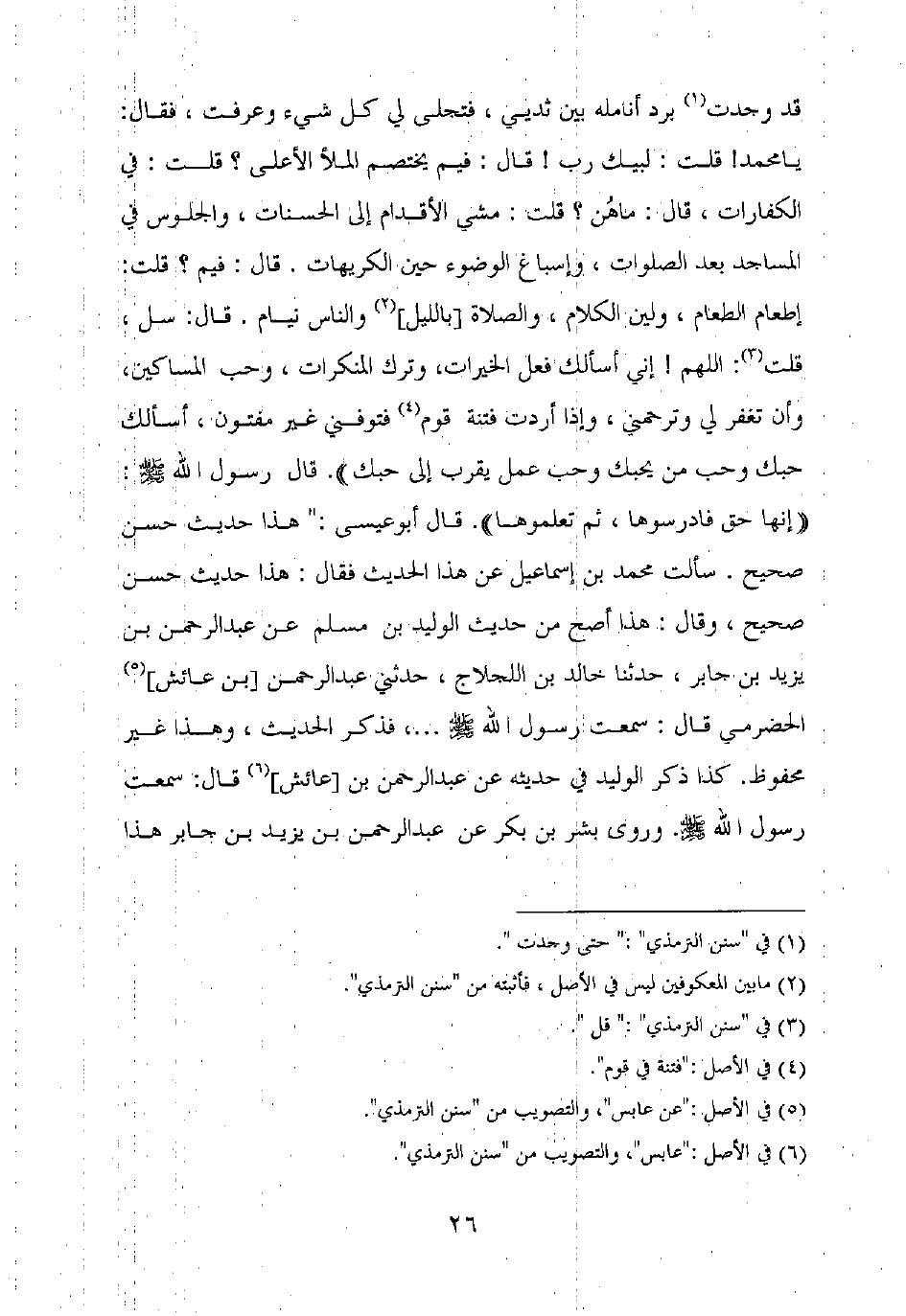قد وجدت برد أنامله بين ثديي، فتجلى لي كل شيء وعرفت، فقال: يا محمد! قلت: لبيك رب! قال: فيم يختصم الملأ الأعلى؟ قلت: في الكفارات، قال: ما هن؟ قلت: مشي الأقدام إلى الحسنات، والجلوس في المساجد بعد الصلوات، وإسباغ الوضوء حين الكريهات. قال: فيم؟ قلت: إطعام الطعام، ولين الكلام، والصلاة [بالليل] والناس نيام. قال: سل، قلت: اللهم! إني أسألك فعل الخيرات، وترك المنكرات، وحب المساكين، وأن تغفر لي وترحمني، وإذا أردت فتنة قوم فتوفني غير مفتون، أسألك حبك وحب من يحبك وحب عمل يقرب إلى حبك". قال رسول الله صلى الله عليه وسلم: "إنها حق فادرسوها، ثم تعلموها". قال أبو عيسى: "هذا حديث حسن صحيح. سألت محمد بن إسماعيل عن هذا الحديث فقال: هذا حديث حسن صحيح، وقال: هذا أصح من حديث الوليد بن مسلم عن عبد الرحمن بن يزيد بن جابر، حدثنا خالد بن اللجلاج، حدثني عبد الرحمن [بن عائش] الحضرمي قال: سمعت رسول الله صلى الله عليه وسلم ..... ، فذكر الحديث، وهذا غير محفوظ. كذا ذكر الوليد في حديثه عن عبد الرحمن بن [عائش] قال: سمعت رسول الله صلى الله عليه وسلم. وروى بشر بن بكر عن عبد الرحمن بن يزيد بن جابر هذا