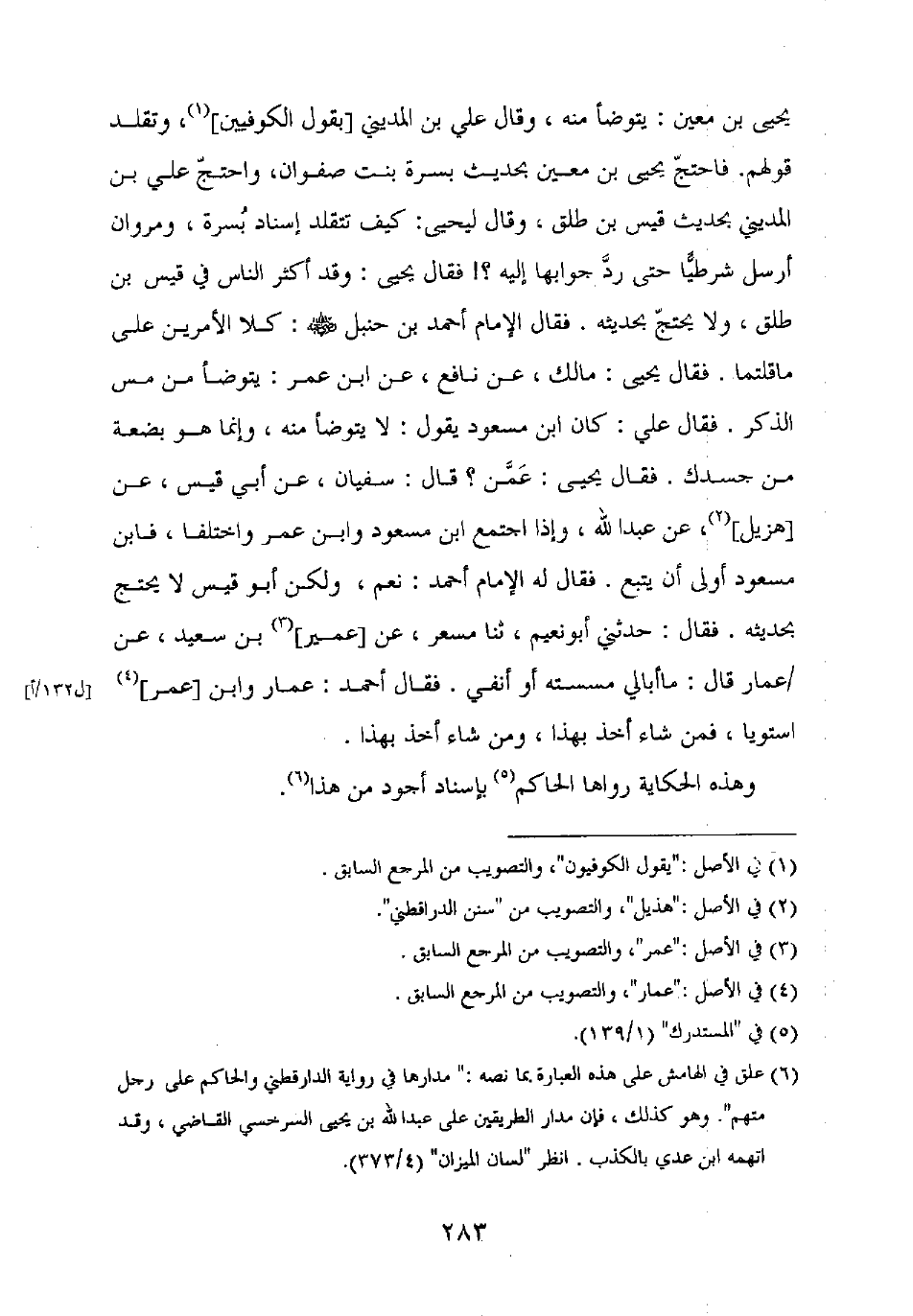 يحيى بن معين: يتوضأ منه، وقال علي بن المديني [بقول الكوفيين]، وتقلد قولهم. فاحتج يحيى بن معين بحديث بسرة بنت صفوان، واحتج علي بن المديني بحديث قيس بن طلق، وقال ليحيى: كيف تتقلد إسناد بسرة، ومروان أرسل شرطيا حتى رد جوابها إليه؟! فقال يحيى: وقد أكثر الناس في قيس بن طلق، ولا يحتج بحديثه. فقال الإمام أحمد بن حنبل رضي الله عنه: كلا الأمرين على ما قلتما. فقال يحيى: مالك، عن نافع، عن ابن عمر: يتوضأ من مس الذكر. فقال علي: كان ابن مسعود يقول: لا يتوضأ منه، وإنما هو بضعة من جسدك. فقال يحيى: عمن؟ قال: سفيان، عن أبي قيس، عن [هزيل]، عن عبد الله، وإذا اجتمع ابن مسعود وابن عمر واختلفا، فابن مسعود أولى أن يتبع. فقال له الإمام أحمد: نعم، ولكن أبو قيس لا يحتج بحديثه. فقال: حدثني أبو نعيم، ثنا مسعر، عن [عمير] بن سعيد، عن عمار قال: ما أبالي مسسته أو أنفي. فقال أحمد: عمار وابن [عمر] استويا، فمن شاء أخذ بهذا، ومن شاء أخذ بهذا.