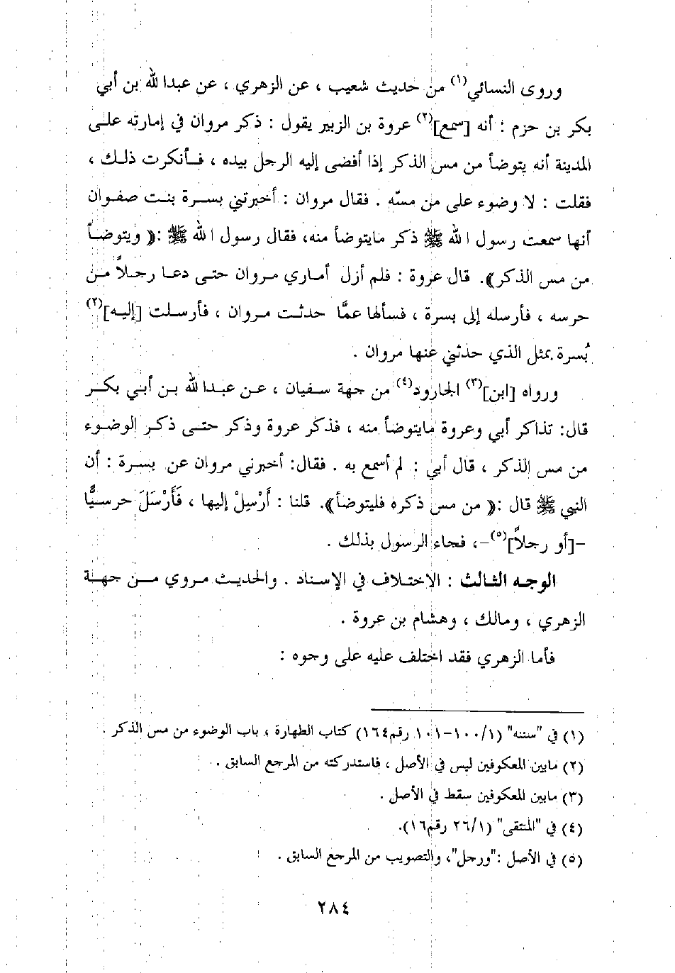 وروى النسائي من حديث شعيب، عن الزهري، عن عبد الله بن أبي بكر بن حزم: أنه [سمع] عروة بن الزبير يقول: ذكر مروان في إمارته على المدينة أنه يتوضأ من مس الذكر إذا أفضى إليه الرجل بيده، فأنكرت ذلك، فقلت: لا وضوء على من مسه. فقال مروان: أخبرتني بسرة بنت صفوان أنها سمعت رسول الله صلى الله عليه وسلم ذكر ما يتوضأ منه، فقال رسول الله صلى الله عليه وسلم: "ويتوضأ من مس الذكر". قال عروة: فلم أزل أماري مروان حتى دعا رجلا من حرسه، فأرسله إلى بسرة، فسألها عما حدثت مروان، فأرسلت [إليه] بسرة بمثل الذي حدثني عنها مروان.