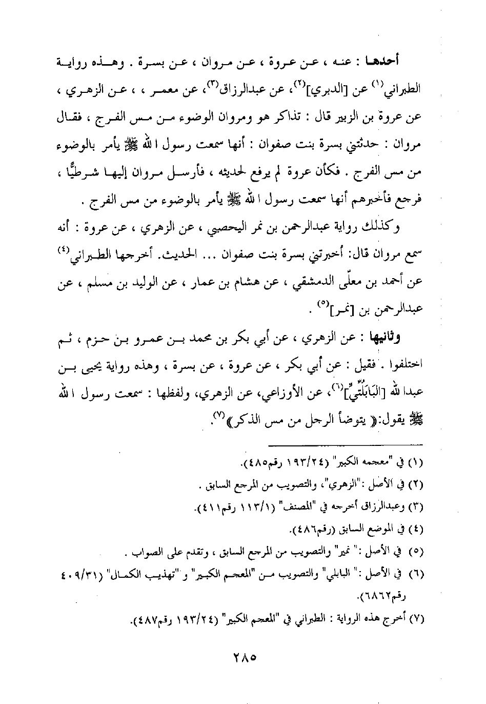 أحدها: عنه، عن عروة، عن مروان، عن بسرة. وهذه رواية الطبراني عن [الدبري]، عن عبد الرزاق، عن معمر، عن الزهري، عن عروة بن الزبير قال: تذاكر هو ومروان الوضوء من مس الفرج، فقال مروان: حدثتني بسرة بنت صفوان: أنها سمعت رسول الله صلى الله عليه وسلم يأمر بالوضوء من مس الفرج. فكأن عروة لم يرفع لحديثه، فأرسل مروان إليها شرطيا، فرجع فأخبرهم أنها سمعت رسول الله صلى الله عليه وسلم يأمر بالوضوء من مس الفرج.