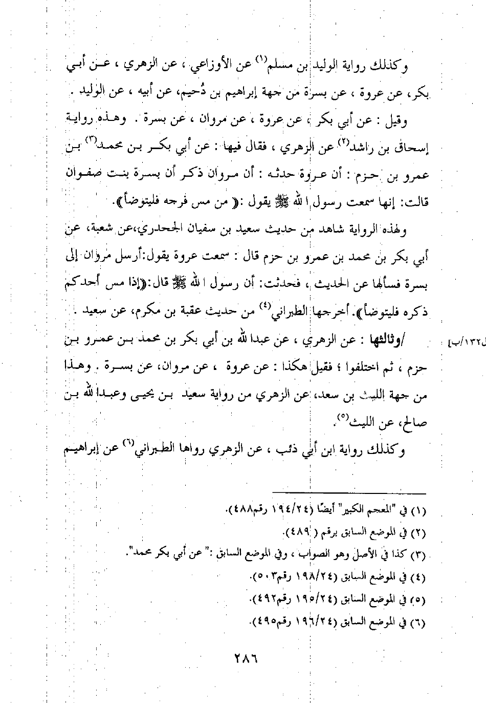 وثالثها: عن الزهري، عن عبد الله بن أبي بكر بن محمد بن عمرو بن حزم، ثم اختلفوا، فقيل هكذا: عن عروة، عن مروان، عن بسرة. وهذا من جهة الليث بن سعد، عن الزهري من رواية سعيد بن يحيى وعبد الله بن صالح، عن الليث.