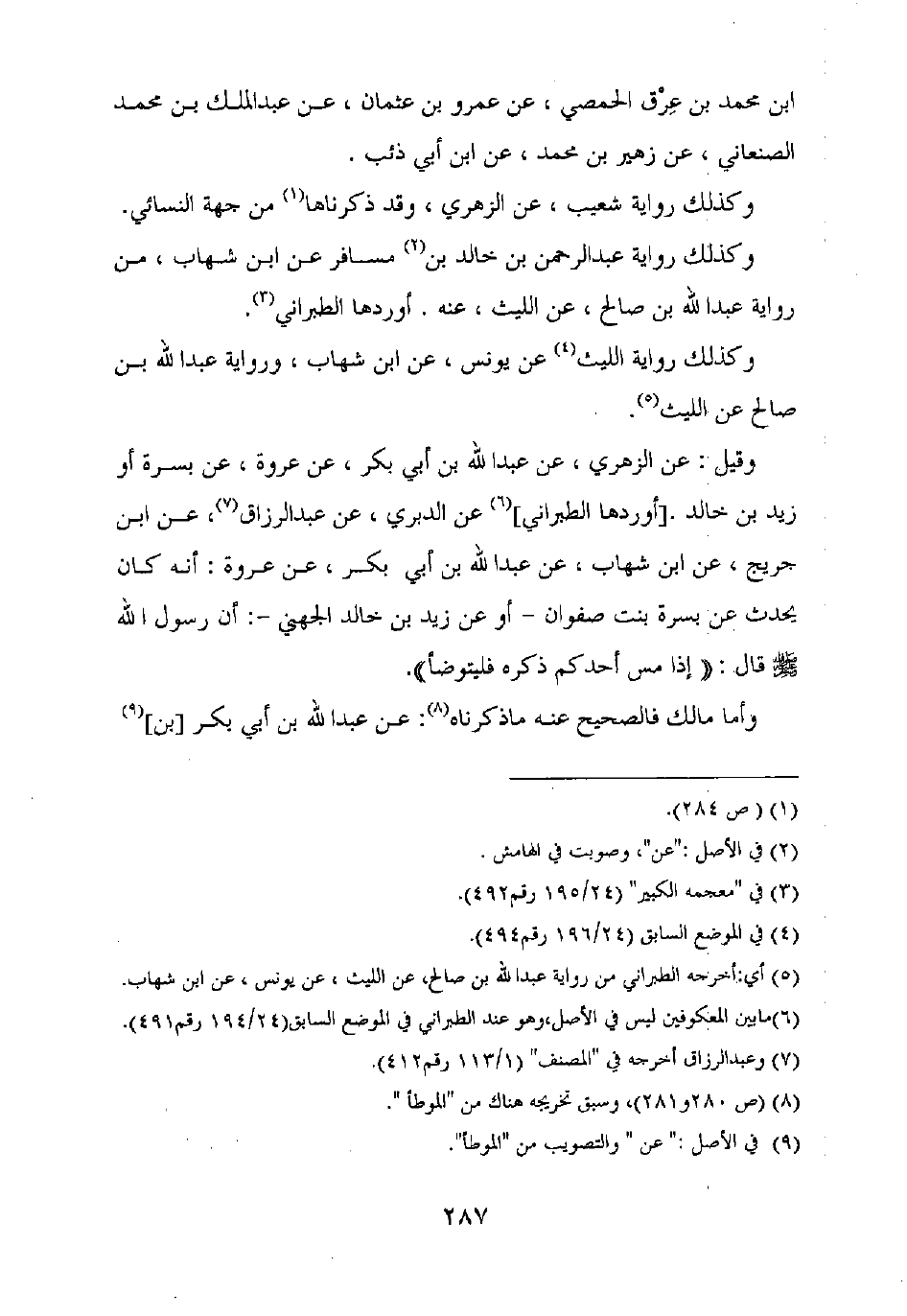 وقيل: عن الزهري، عن عبد الله بن أبي بكر، عن عروة، عن بسرة أو زيد بن خالد. [أوردها الطبراني] عن الدبري، عن عبد الرزاق، عن ابن جريج، عن ابن شهاب، عن عبد الله بن أبي بكر، عن عروة: أنه كان يحدث عن بسرة بنت صفوان – أو عن زيد بن خالد الجهني –: أن رسول الله صلى الله عليه وسلم قال: "إذا مس أحدكم ذكره فليتوضأ".