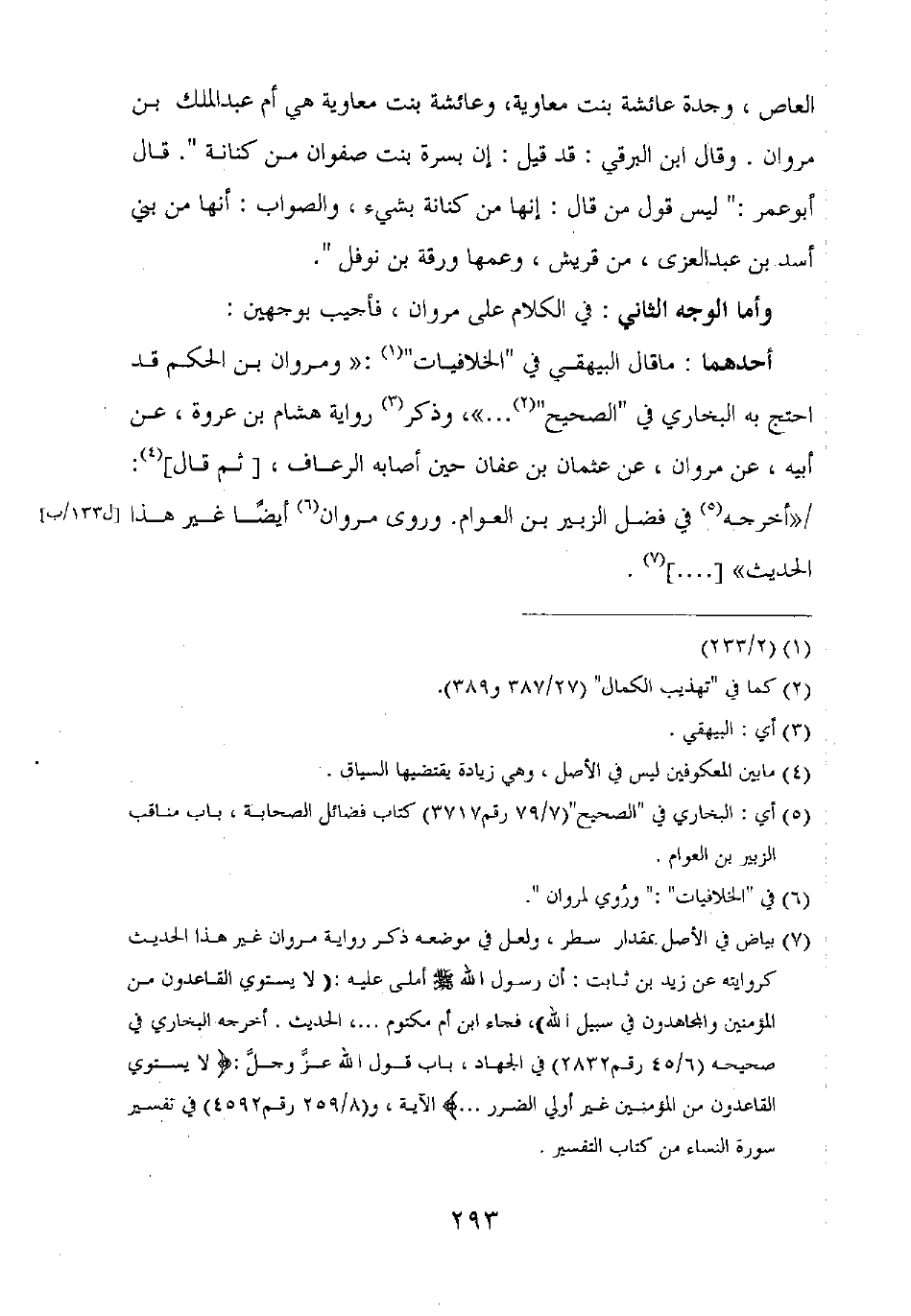 أحدهما: ما قال البيهقي في "الخلافيات": "ومروان بن الحكم قد احتج به البخاري في "الصحيح" ... "، وذكر رواية هشام بن عروة، عن أبيه، عن مروان، عن عثمان بن عفان حين أصابه الرعاف، [ثم قال]: "اخرجه في فضل الزبير بن العوام. وروى مروان أيضا غير هذا الحديث" [ .... ].