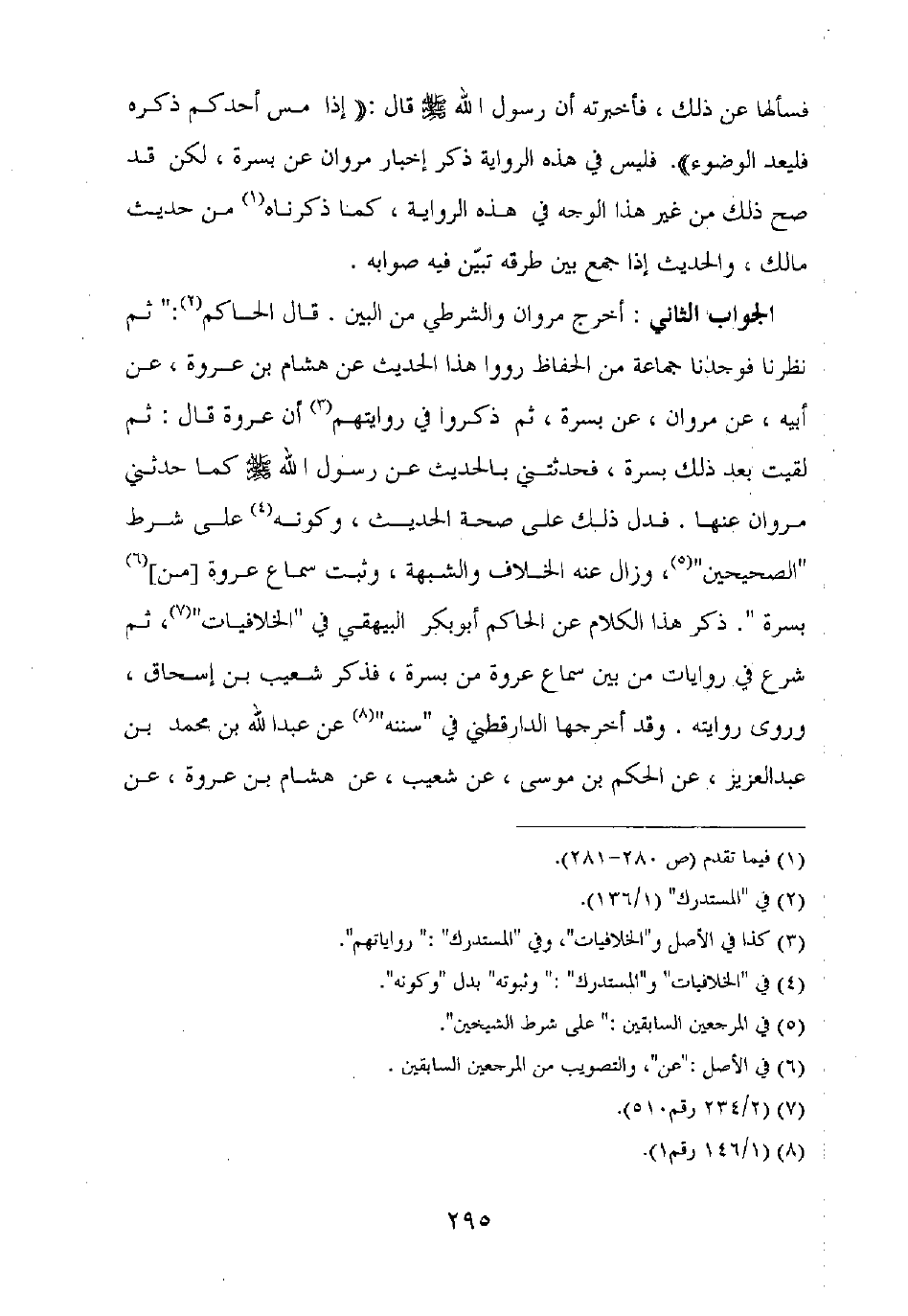الجواب الثاني: أخرج مروان والشرطي من البين. قال الحاكم: "ثم نظرنا فوجدنا جماعة من الحفاظ رووا هذا الحديث عن هشام بن عروة، عن أبيه، عن مروان، عن بسرة، ثم ذكروا في روايتهم أن عروة قال: ثم لقيت بعد ذلك بسرة، فحدثتني بالحديث عن رسول الله صلى الله عليه وسلم كما حدثني مروان عنها. فدل ذلك على صحة الحديث، وكونه على شرط "الصحيحين"، وزال عنه الخلاف والشبهة، وثبت سماع عروة [من] بسرة". ذكر هذا الكلام عن الحاكم أبو بكر البيهقي في "الخلافيات"، ثم شرع في روايات من بين سماع عروة من بسرة، فذكر شعيب بن إسحاق، وروى روايته. وقد أخرجها الدارقطني في "سننه" عن عبد الله بن محمد بن عبد العزيز، عن الحكم بن موسى، عن شعيب، عن هشام بن عروة، عن