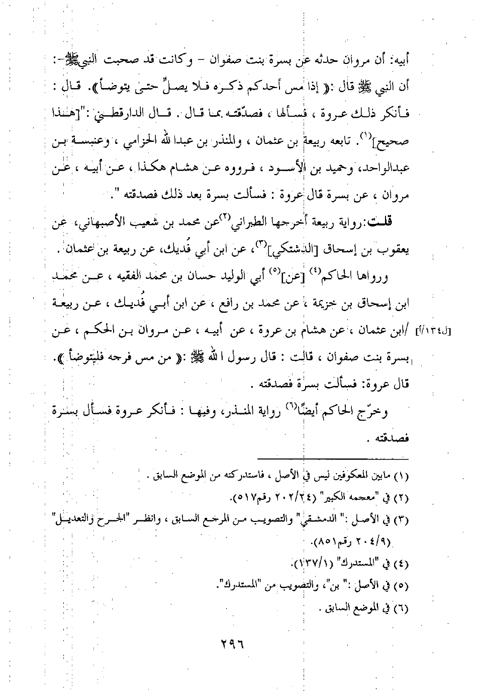 أبيه: أن مروان حدثه عن بسرة بنت صفوان – وكانت قد صحبت النبي صلى الله عليه وسلم –: أن النبي صلى الله عليه وسلم قال: "إذا مس أحدكم ذكره فلا يصل حتى يتوضأ". قال: فأنكر ذلك عروة، فسألها، فصدقته بما قال. قال الدارقطني: " [هذا صحيح]. تابعه ربيعة بن عثمان، والمنذر بن عبد الله الحزامي، وعنبسة بن عبد الواحد، وحميد بن الأسود، فرووه عن هشام هكذا، عن أبيه، عن مروان، عن بسرة قال عروة: فسألت بسرة بعد ذلك فصدقته".