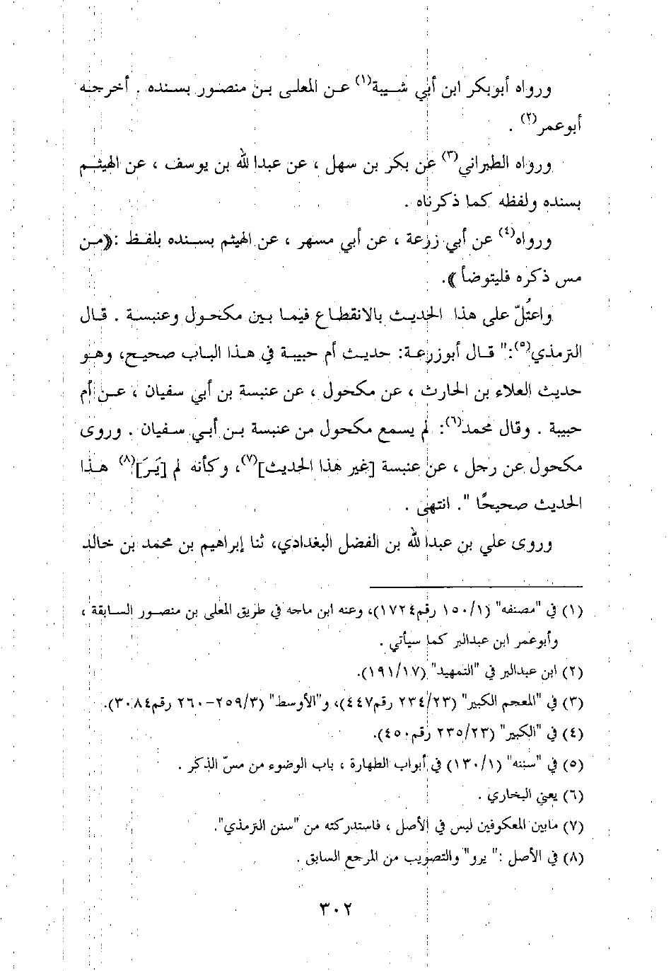 واعتل على هذا الحديث بالانقطاع فيما بين مكحول وعنبسة. قال الترمذي: "قال أبو زرعة: حديث أم حبيبة في هذا الباب صحيح، وهو حديث العلاء بن الحارث، عن مكحول، عن عنبسة بن أبي سفيان، عن أم حبيبة. وقال محمد: لم يسمع مكحول من عنبسة بن أبي سفيان. وروى مكحول عن رجل، عن عنبسة [غير هذا الحديث]، وكأنه لم [ير] هذا الحديث صحيحا". انتهى.