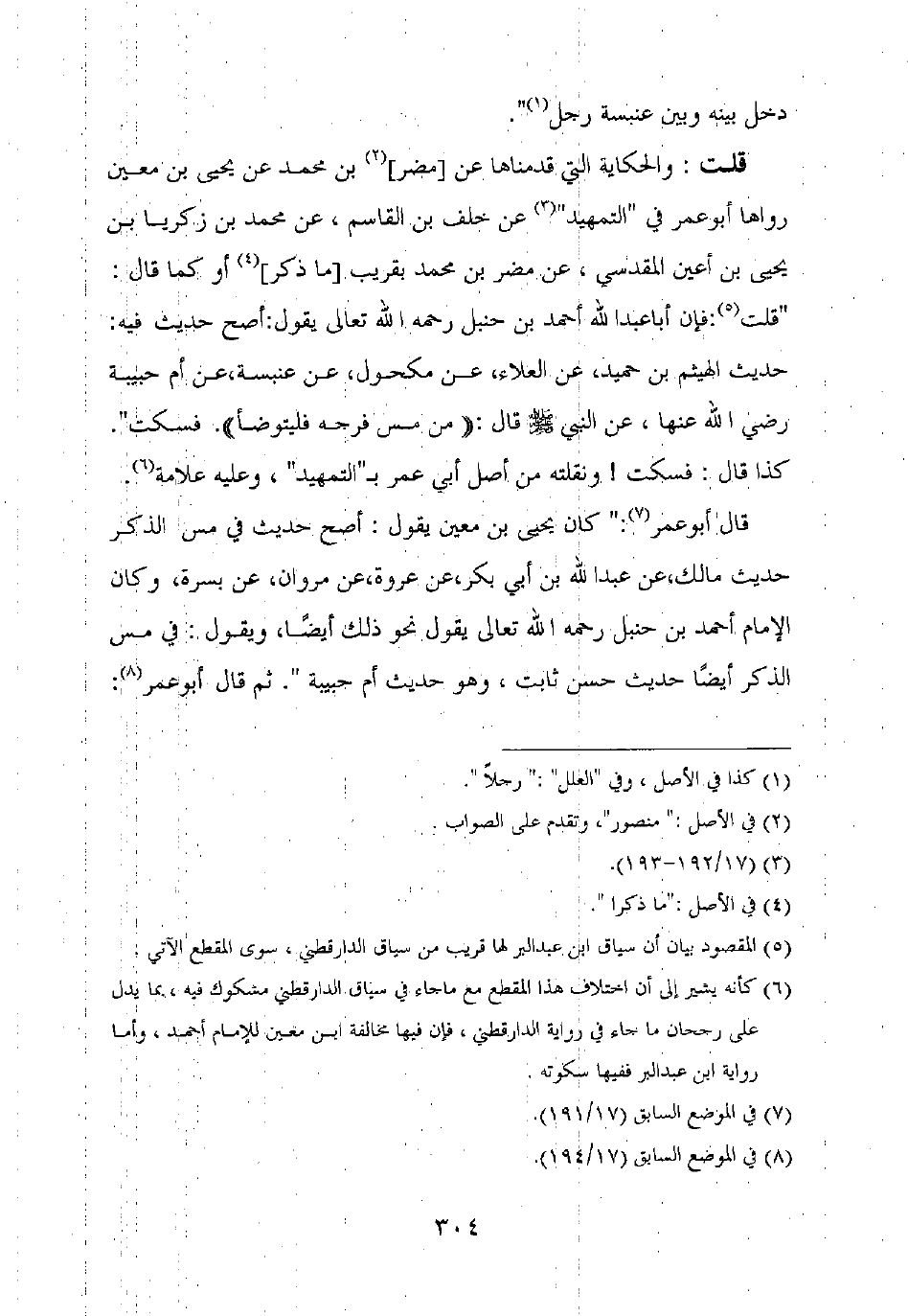 قلت: والحكاية التي قدمناها عن [مضر] بن محمد عن يحيى بن معين رواها أبو عمر في "التمهيد" عن خلف بن القاسم، عن محمد بن زكريا بن يحيى بن أعين المقدسي، عن مضر بن محمد بقريب [ما ذكر] أو كما قال: "قلت: فإن أبا عبد الله أحمد بن حنبل رحمه الله تعالى يقول: أصح حديث فيه: حديث الهيثم بن حميد، عن العلاء، عن مكحول، عن عنبسة، عن أم حبيبة رضي الله عنها، عن النبي صلى الله عليه وسلم قال: "من مس فرجه فليتوضأ". فسكت ".