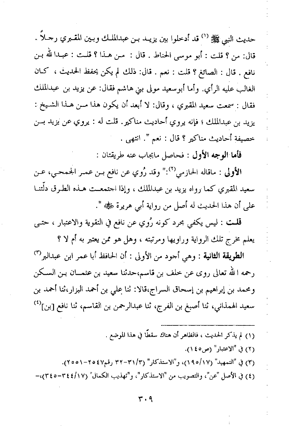 الطريقة الثانية: وهي أجود من الأولى: أن الحافظ أبا عمر ابن عبد البر رحمه الله تعالى روى عن خلف بن قاسم، حدثنا سعيد بن عثمان بن السكن ومحمد بن إبراهيم بن إسحاق السراج قالا: ثنا علي بن أحمد البزار، ثنا أحمد بن سعيد الهمذاني، ثنا أصبغ بن الفرج، ثنا عبد الرحمن بن القاسم، ثنا نافع [بن]