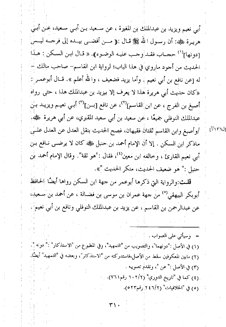 أبي نعيم ويزيد بن عبد الملك بن المغيرة، عن سعيد بن أبي سعيد، عن أبي هريرة رضي الله عنه: أن رسول الله صلى الله عليه وسلم قال: "من أفضى بيده إلى فرجه ليس [دونها] حجاب فقد وجب عليه الوضوء". "قال ابن السكن: هذا الحديث من أجود ما روي في هذا الباب، لرواية ابن القاسم – صاحب مالك – له [عن نافع بن أبي نعيم. وأما يزيد فضعيف، والله أعلم ". قال أبو عمر: "كان حديث أبي هريرة هذا لا يعرف إلا بيزيد بن عبد الملك هذا، حتى رواه أصبغ بن الفرج، عن ابن القاسم]، عن نافع [بن] أبي نعيم ويزيد بن عبد الملك النوفلي جميعا، عن سعيد بن أبي سعيد المقبري، عن أبي هريرة رضي الله عنه. وأصبغ وابن القاسم ثقتان فقيهان، فصح الحديث بنقل العدل عن العدل على ما ذكر ابن السكن. إلا أن الإمام أحمد بن حنبل رضي الله عنه كان لا يرضى نافع بن أبي نعيم القارئ، وخالفه ابن معين، فقال: "هو ثقة". وقال الإمام أحمد بن حنبل: "هو ضعيف الحديث، منكر الحديث" ".