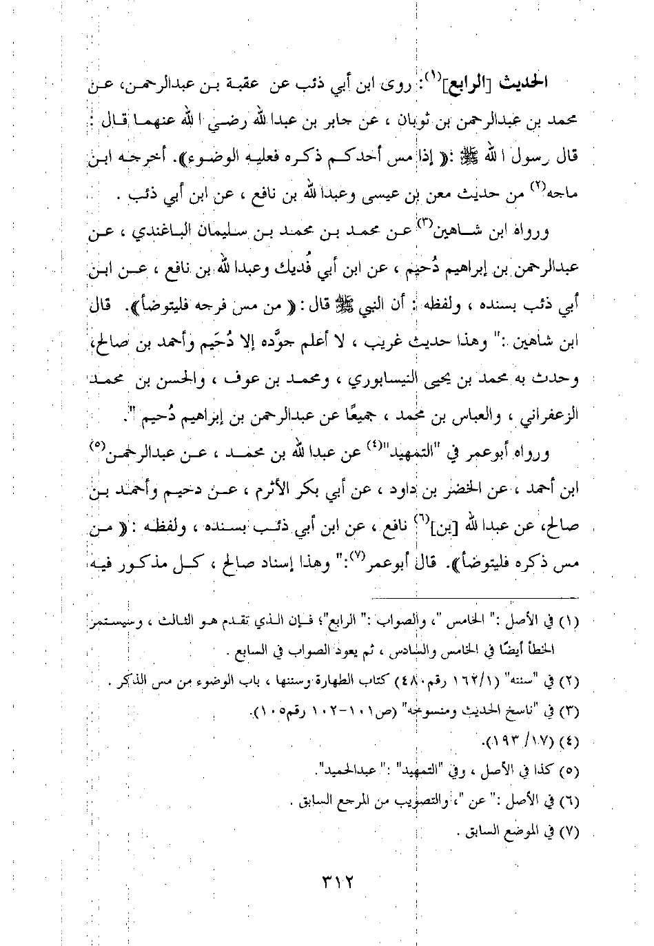 الحديث الرابع: روى ابن أبي ذئب عن عقبة بن عبد الرحمن، عن محمد بن عبد الرحمن بن ثوبان، عن جابر بن عبد الله رضي الله عنهما قال: قال رسول الله صلى الله عليه وسلم: "إذا مس أحدكم ذكره فعليه الوضوء". أخرجه ابن ماجة من حديث معن بن عيسى وعبد الله بن نافع، عن ابن أبي ذئب.