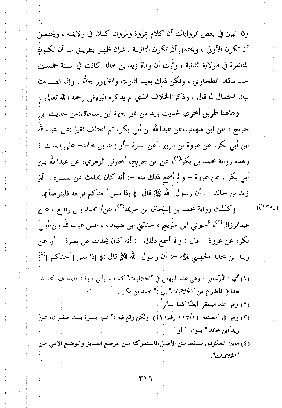 وهذه رواية محمد بن بكر، عن ابن جريج، أخبرني الزهري، عن عبد الله بن أبي بكر، عن عروة – ولم اسمع ذلك منه –: أنه كان يحدث عن بسرة – أو زيد بن خالد –: أن رسول الله صلى الله عليه وسلم قال: "إذا مس أحدكم فرجه فليتوضأ".