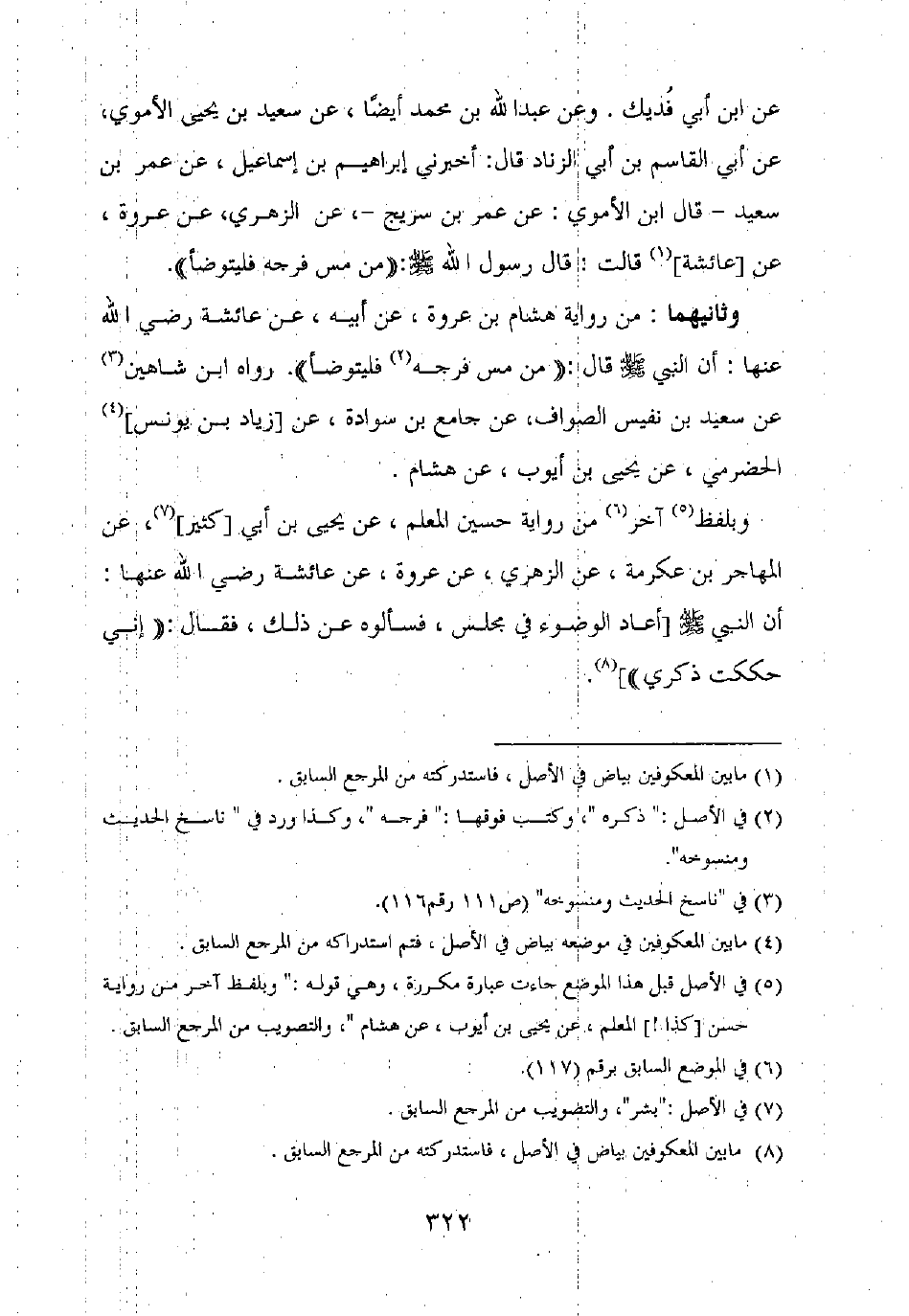عن ابن أبي فديك. وعن عبد الله بن محمد أيضا، عن سعيد بن يحيى الأموي، عن أبي القاسم بن أبي الزناد قال: أخبرني إبراهيم بن إسماعيل، عن عمر بن سعيد – قال ابن الأموي: عن عمر بن سريج –، عن الزهري، عن عروة، عن [عائشة] قالت: قال رسول الله صلى الله عليه وسلم: "من مس فرجه فليتوضأ".