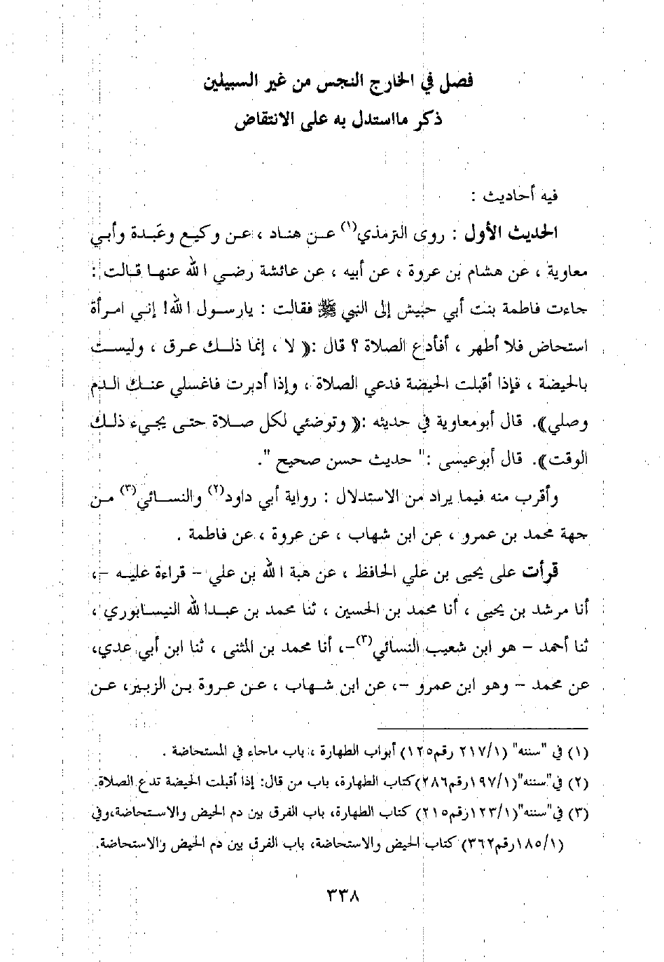 الحديث الأول: روى الترمذي عن هناد، عن وكيع وعبدة وأبي معاوية، عن هشام بن عروة، عن أبيه، عن عائشة رضي الله عنها قالت: جاءت فاطمة بنت أبي حبيش إلى النبي صلى الله عليه وسلم فقالت: يا رسول الله!