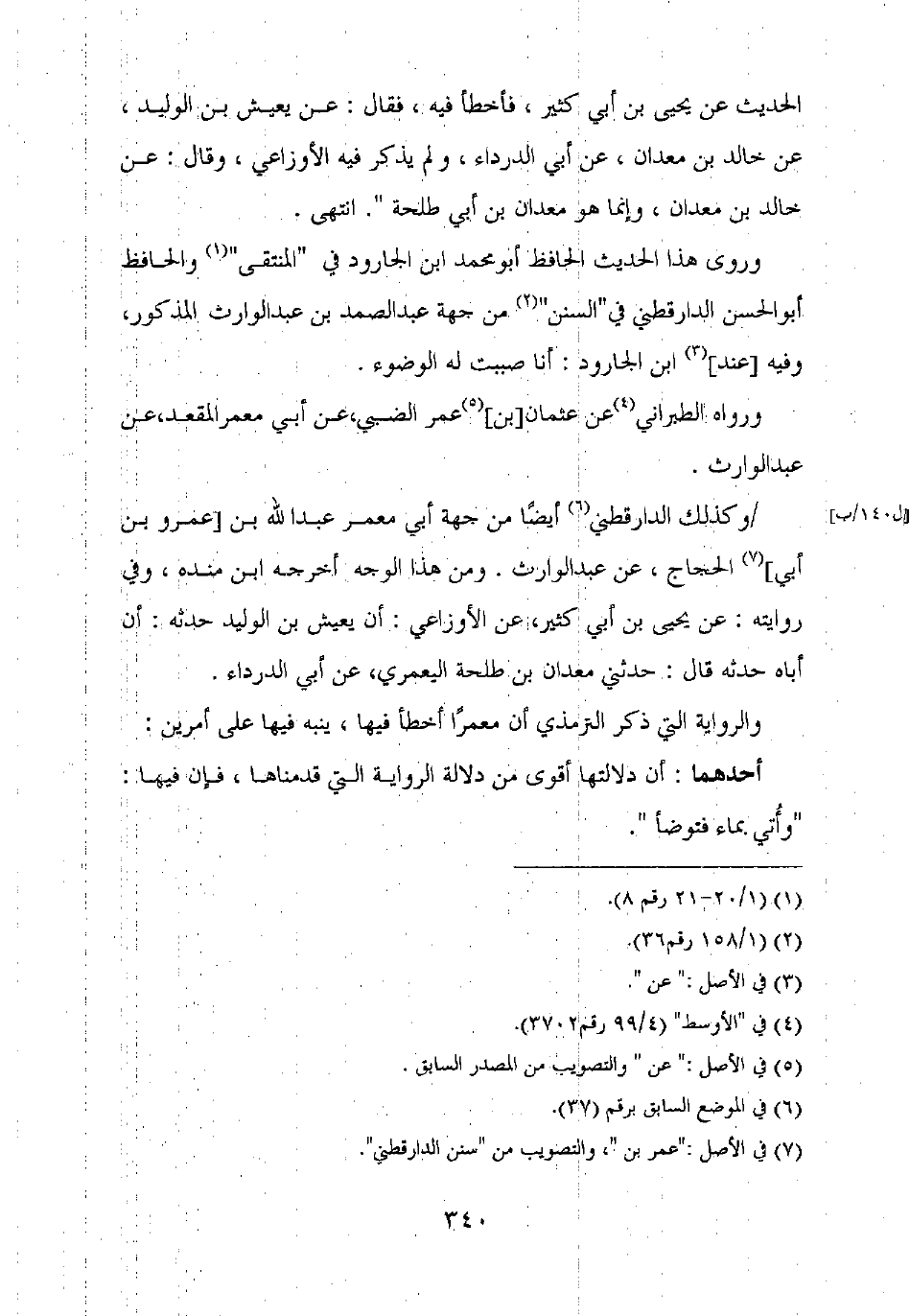 وكذلك الدارقطني أيضا من جهة أبي معمر عبد الله بن [عمرو بن أبي] الحجاج، عن عبد الوارث. ومن هذا الوجه أخرجه ابن منده، وفي روايته: عن يحيى بن أبي كثير، عن الأوزاعي: أن يعيش بن الوليد حدثه: أن أباه حدثه قال: حدثني معدان بن طلحة اليعمري، عن أبي الدرداء.
