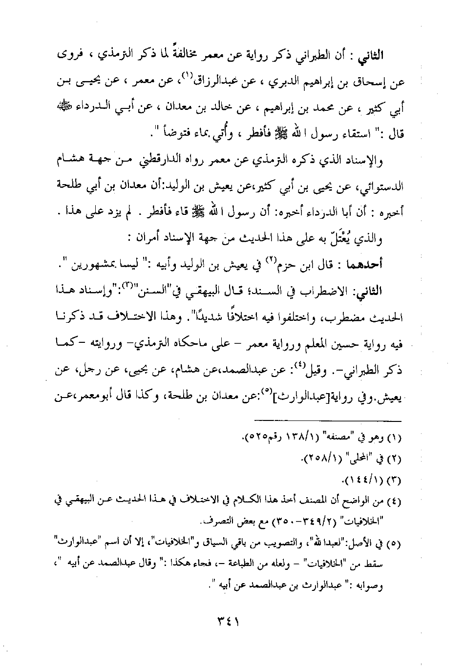 الثاني: الاضطراب في السند، قال البيهقي في "السنن": "وإسناد هذا الحديث مضطرب، واختلفوا فيه اختلافا شديدا". وهذا الاختلاف قد ذكرنا فيه رواية حسين المعلم ورواية معمر – على ما حكاه الترمذي – وروايته – كما ذكر الطبراني –. وقيل: عن عبد الصمد، عن هشام، عن يحيى، عن رجل، عن يعيش. وفي رواية [عبد الوارث]: عن معدان بن طلحة، وكذا قال أبو معمر، عن
