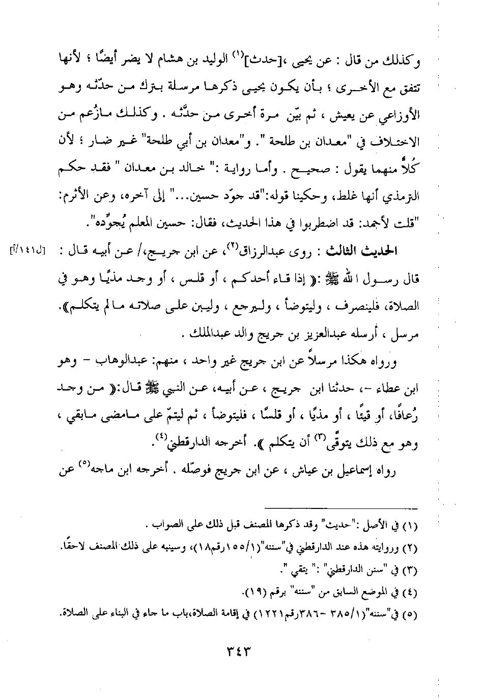 ورواه هكذا مرسلا عن ابن جريج غير واحد، منهم: عبد الوهاب – وهو ابن عطاء –، حدثنا ابن جريج، عن أبيه، عن النبي صلى الله عليه وسلم قال: "من وجد رعافا، أو قيئا، أو مذيا، أو قلسا، فليتوضأ، ثم ليتم على ما مضى ما بقي، وهو مع ذلك يتوقى أن يتكلم". أخرجه الدارقطني.