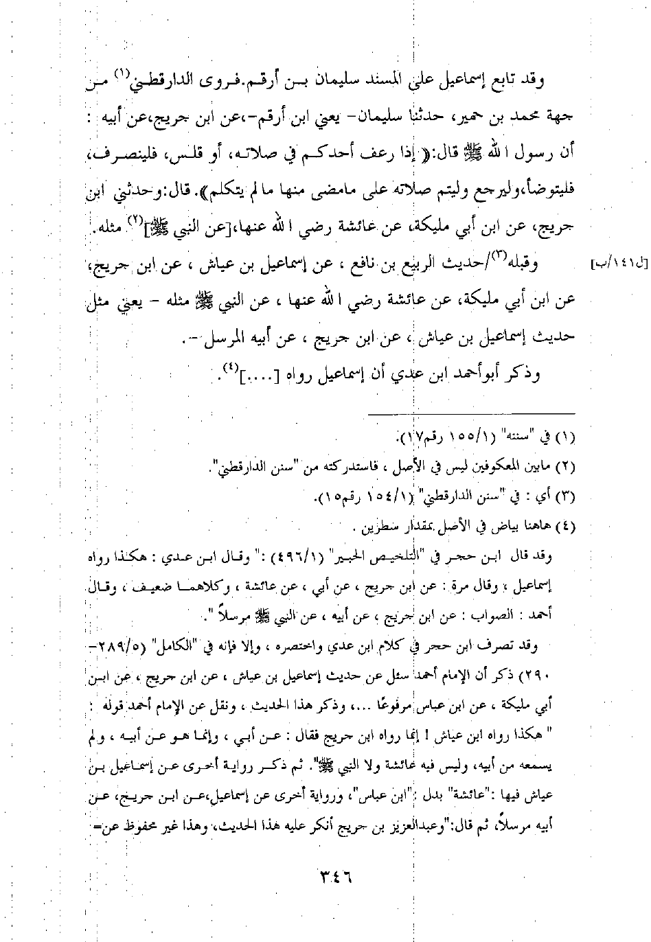 وقد تابع إسماعيل على المسند سليمان بن أرقم. فروى الدارقطني من جهة محمد بن حمير، حدثنا سليمان – يعني ابن أرقم –، عن ابن جريج، عن أبيه: أن رسول الله صلى الله عليه وسلم قال: "إذا رعف أحدكم في صلاته، أو قلس، فلينصرف، فليتوضأ، وليرجع وليتم صلاته على ما مضى منها ما لم يتكلم". قال: وحدثني ابن جريج، عن ابن أبي مليكة، عن عائشة رضي الله عنها، [عن النبي صلى الله عليه وسلم] مثله.