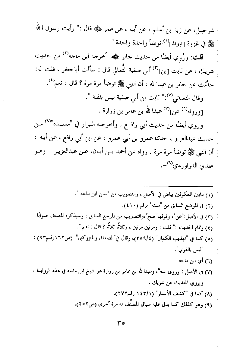 شرحبيل، عن زيد بن أسلم، عن أبيه، عن عمر رضي الله عنه قال: "رأيت رسول الله صلى الله عليه وسلم في غزوة [تبوك] توضأ واحدة واحدة".