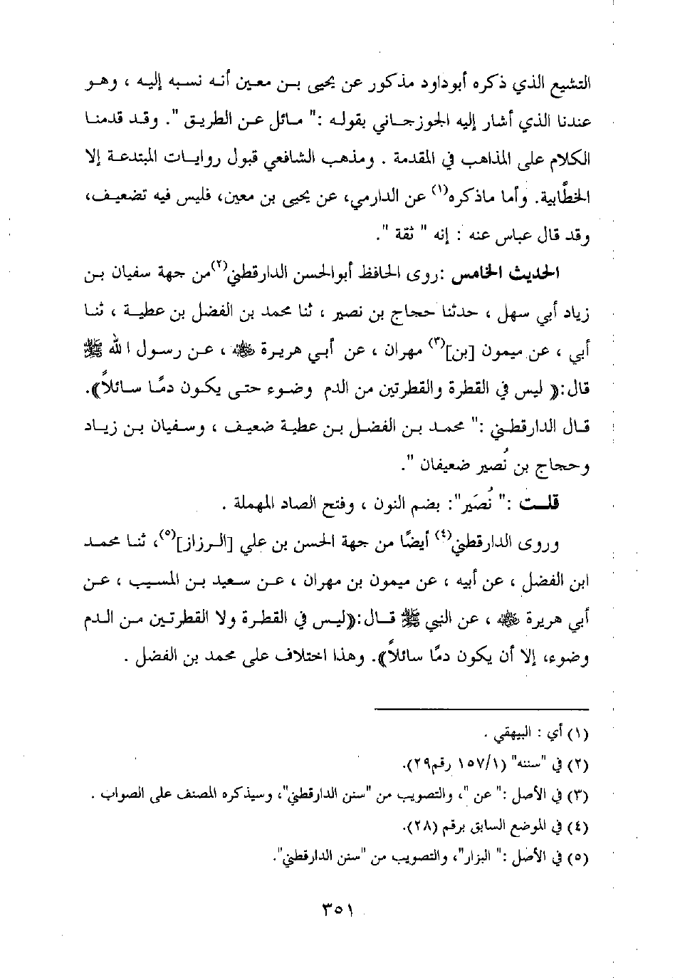 الحديث الخامس: روى الحافظ أبو الحسن الدارقطني من جهة سفيان بن زياد أبي سهل، حدثنا حجاج بن نصير، ثنا محمد بن الفضل بن عطية، ثنا أبي، عن ميمون [بن] مهران، عن أبي هريرة رضي الله عنه، عن رسول الله صلى الله عليه وسلم قال: "ليس في القطرة والقطرتين من الدم وضوء حتى يكون دما سائلا".