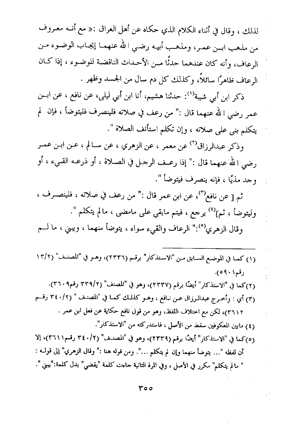 ذكر ابن أبي شيبة: حدثنا هشيم، أنا ابن أبي ليلى، عن نافع، عن ابن عمر رضي الله عنهما قال: "من رعف في صلاته فلينصرف فليتوضأ، فإن لم يتكلم بنى على صلاته، وإن تكلم استأنف الصلاة".