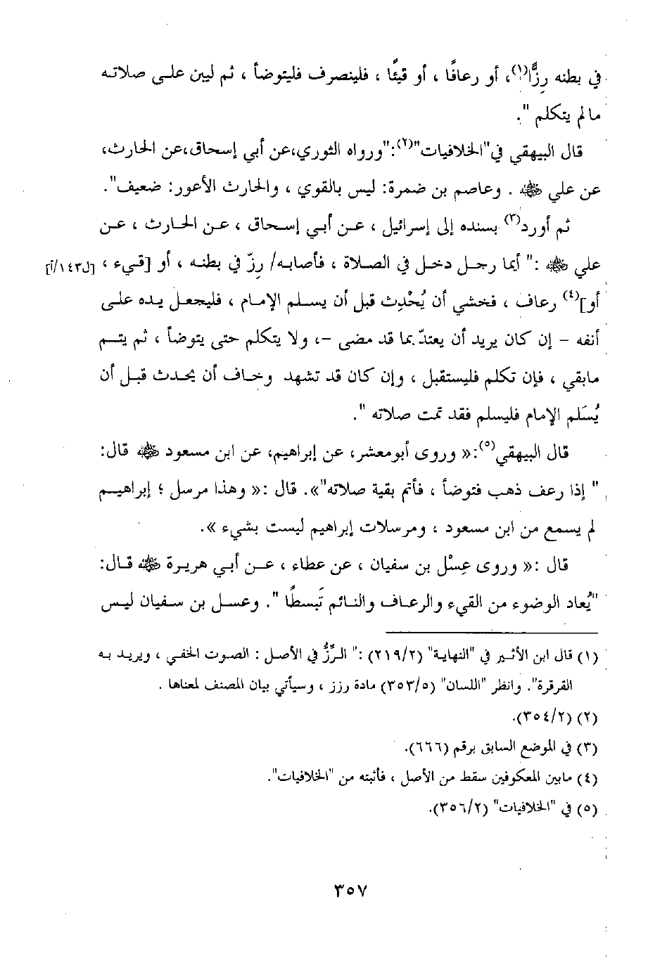 قال البيهقي: "وروى أبو معشر عن إبراهيم، عن ابن مسعود رضي الله عنه قال: "إذا رعف ذهب فتوضأ، فأتم بقية صلاته". قال" وهذا مرسل، إبراهيم لم يسمع من ابن مسعود، ومرسلات إبراهيم ليست بشيء ".