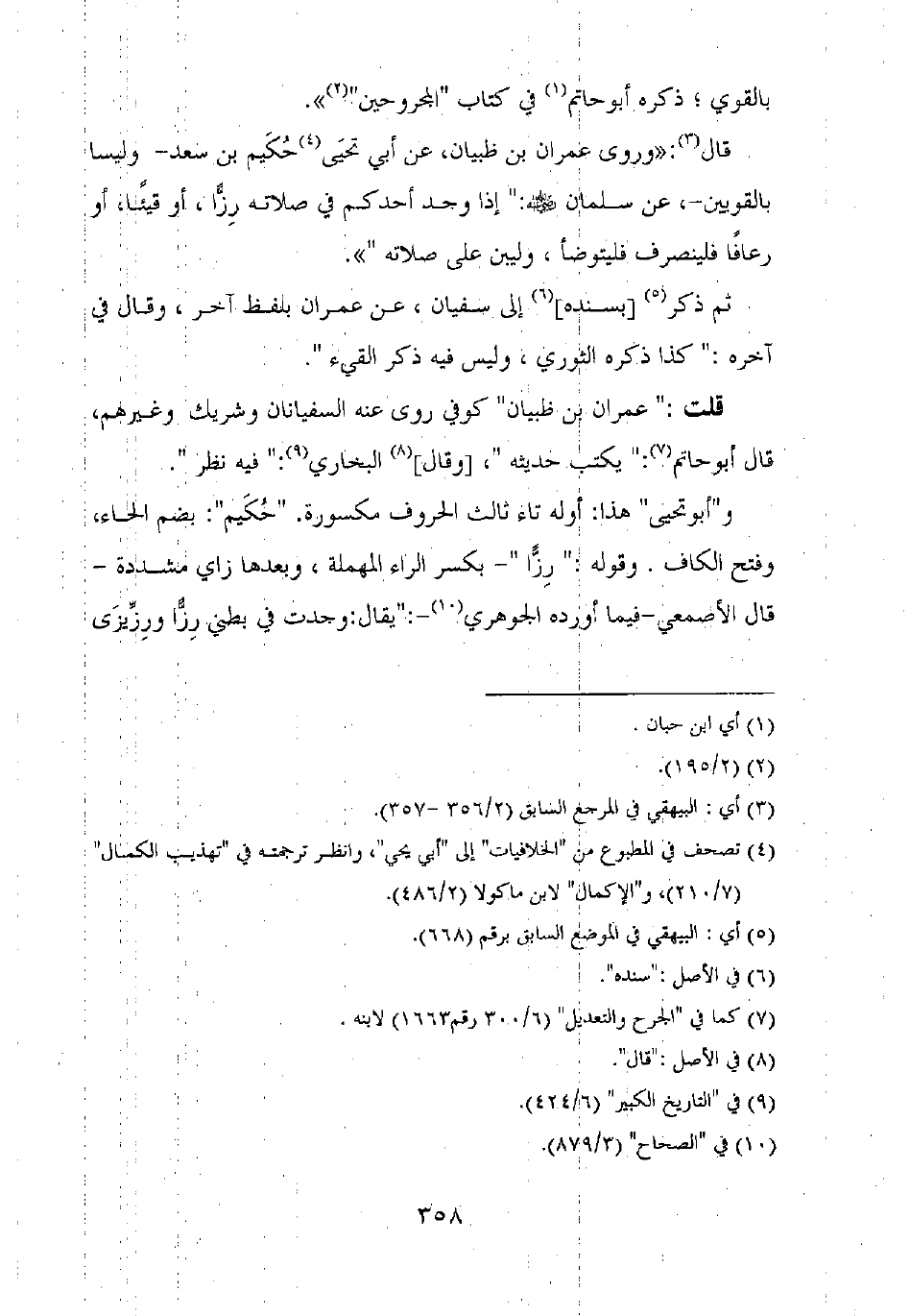 قال: "وروى عمران بن ظبيان، عن أبي تحيى حكيم بن سعد – وليسا بالقويين –، عن سلمان رضي الله عنه: "إذا وجد أحدكم في صلاته رزا، أو قيئا، أو رعافا فلينصرف فليتوضأ، وليبن على صلاته" ".